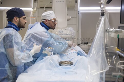 Эндоваскулярный хирург Владимир Манчуров (справа) во время операции чрескожного к...