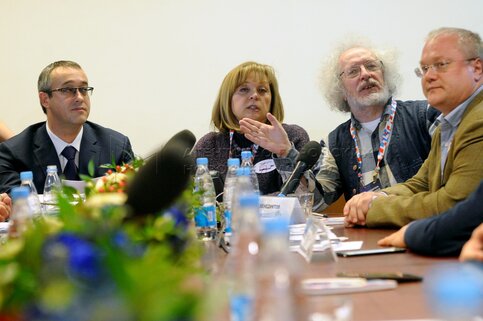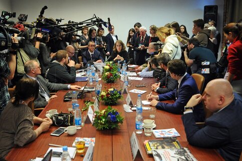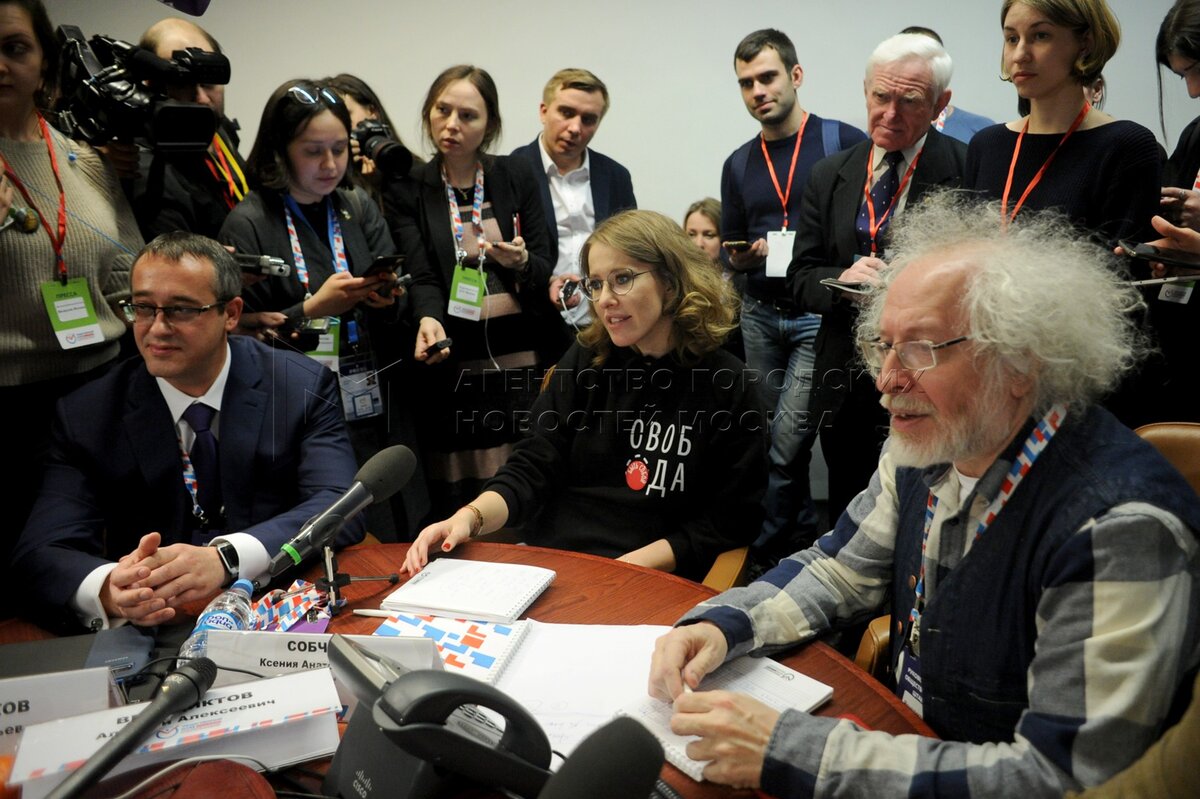 - Описание: Заместитель руководителя Общественного штаба по наблюдению за выборами президента России в Москве Вадим Ковалев, заместитель руководителя Общественного штаба по наблюдению за выборами президента России в Москве, спикер Мосгордумы Алексей Шапошников, телеведущая, кандидат на выборах президента РФ Ксения Собчак (слева направо) в Общественном штабе в день выборов президента РФ.