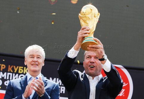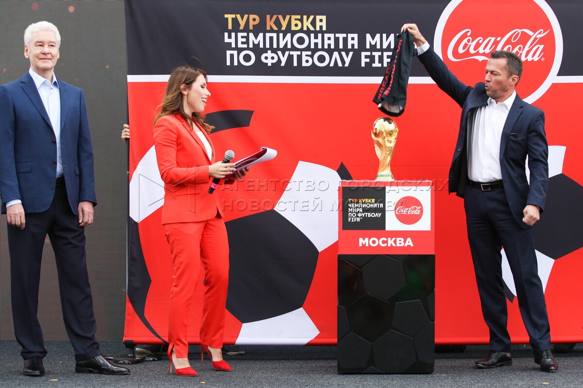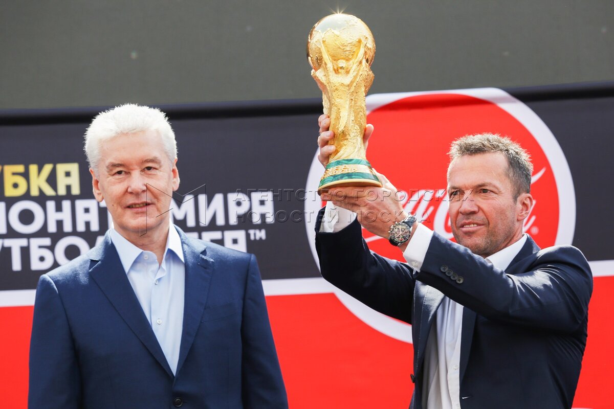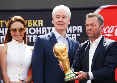 Посол чемпионата мира по футболу 2018 года, чемпионка мира по художественной гимнастике Ляйсан Утяшева, мэр Москвы Сергей Собянин, немецкий футболист Лотар Маттеус (слева направо) во время торжественной церемонии приветствия кубка чемпионата мира по футболу FIFA 2018 на Манежной площади.