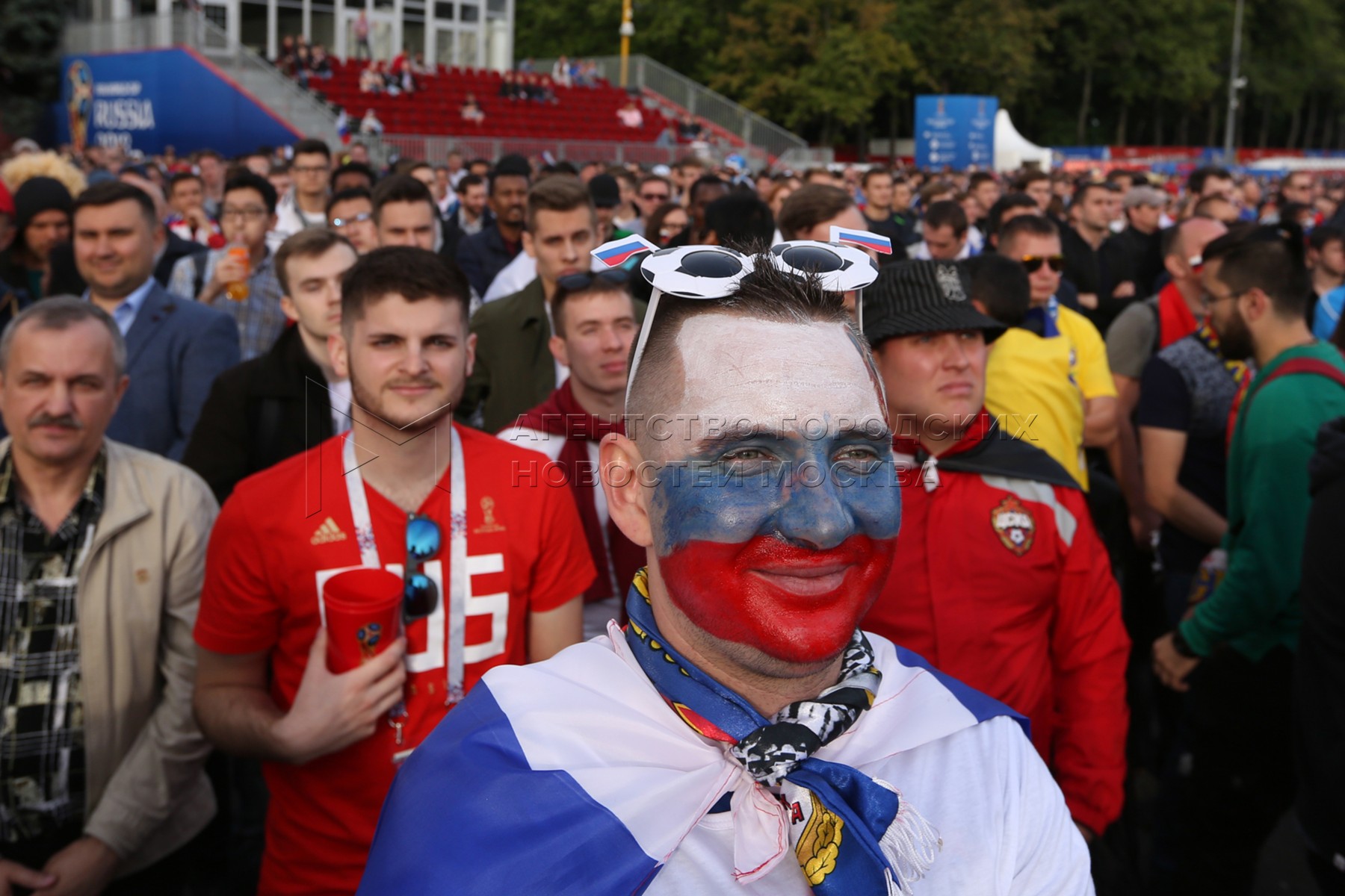 - Описание: Просмотр на фестивале болельщиков FIFA на Воробьевых горах матча чемпионата мира по футболу 2018 г. между сборными России и Саудовской Аравии.