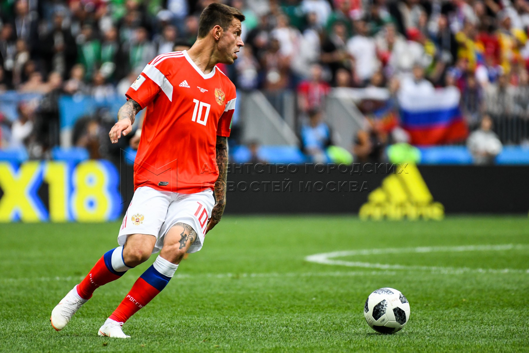 Игрок сборной России Алан Дзагоев во время матча чемпионата мира по футболу 2018 ...