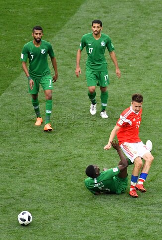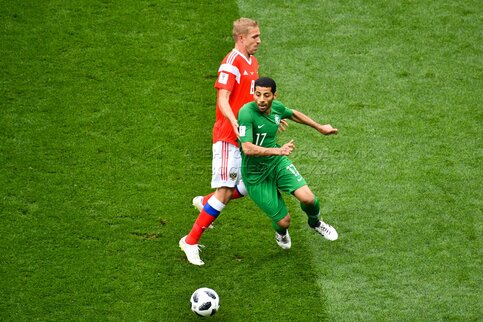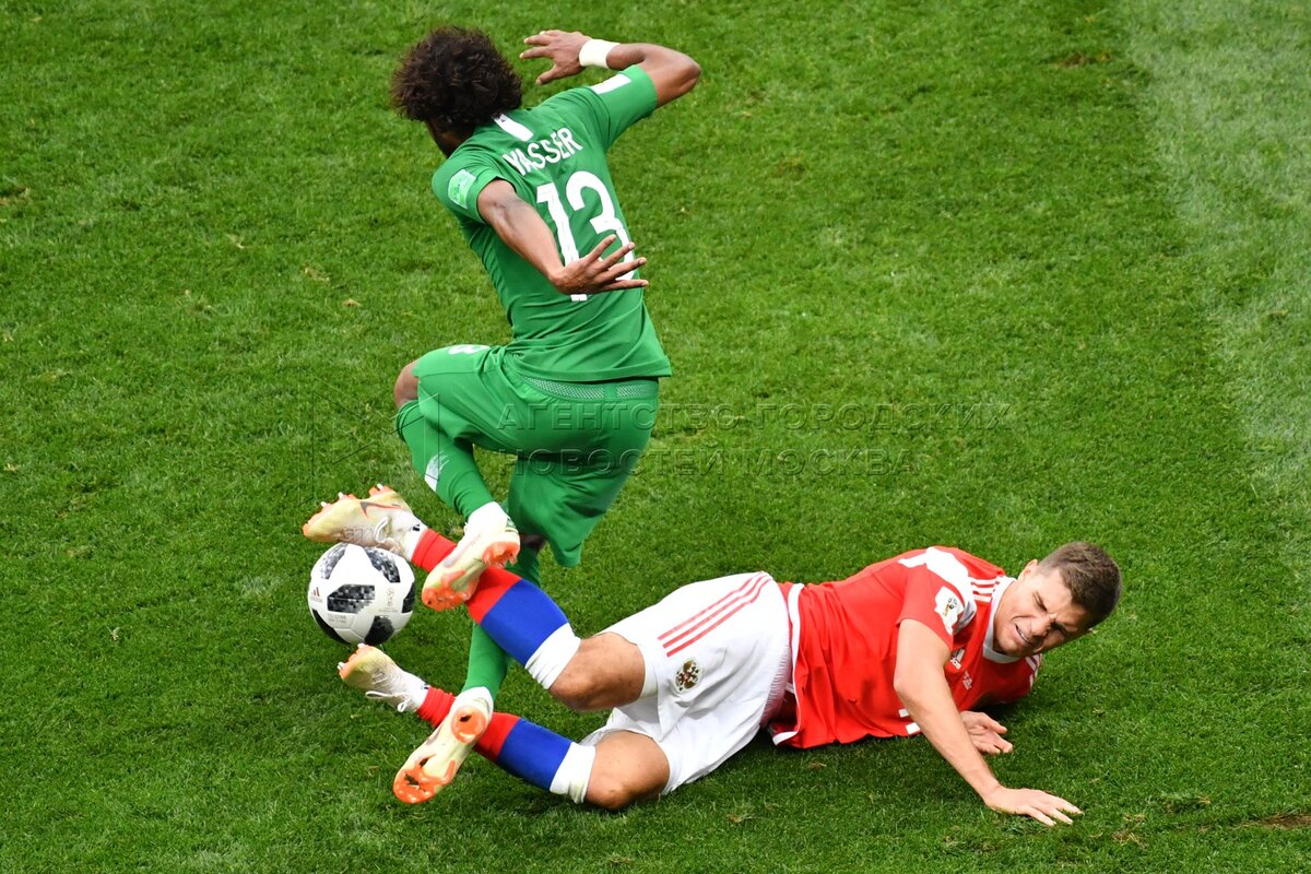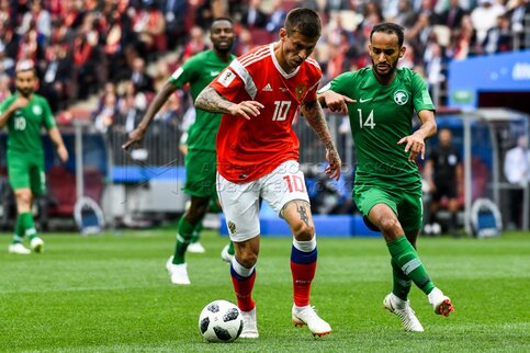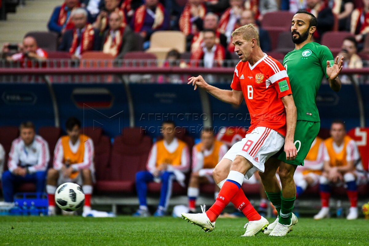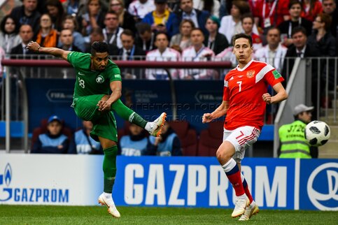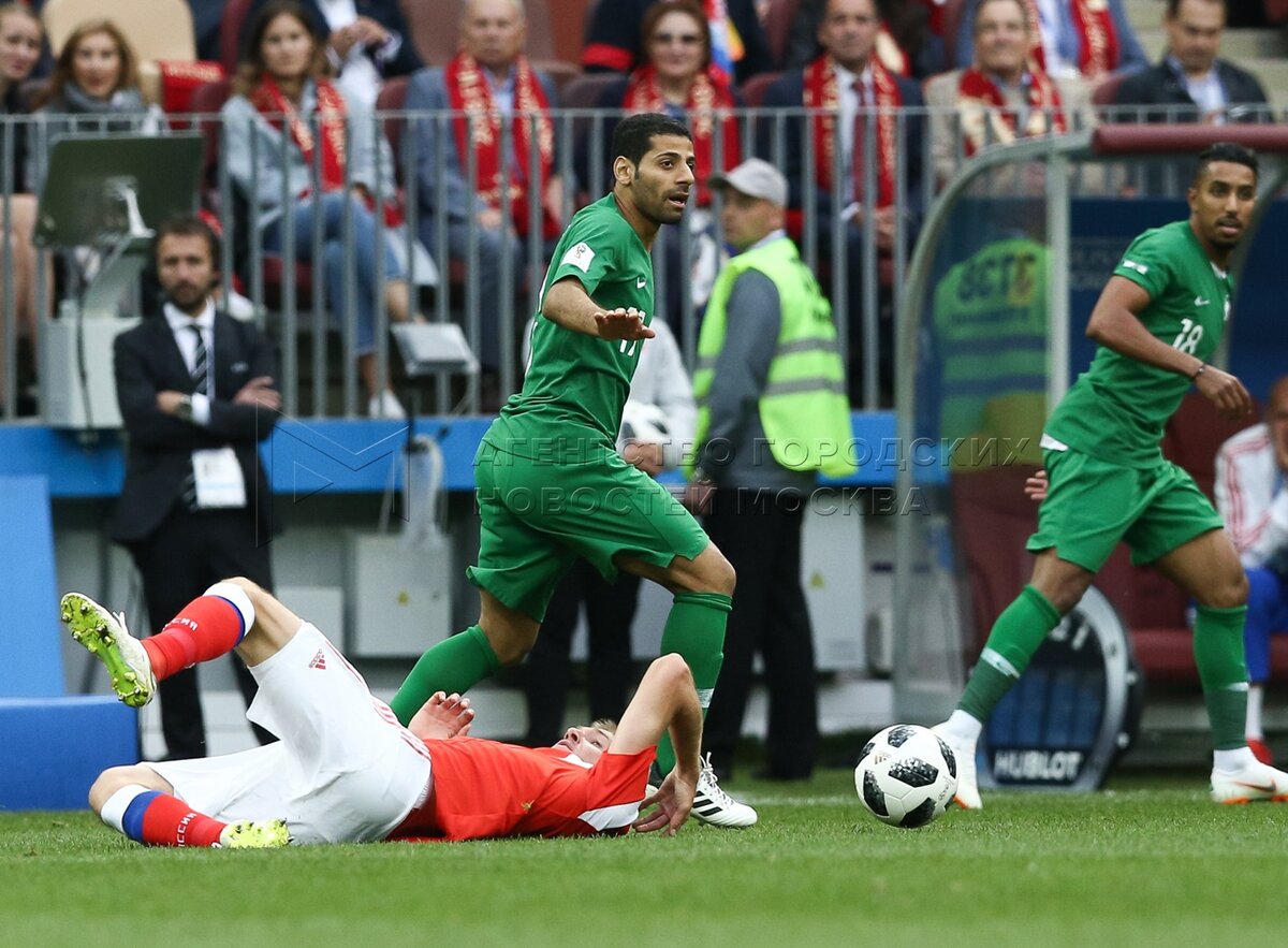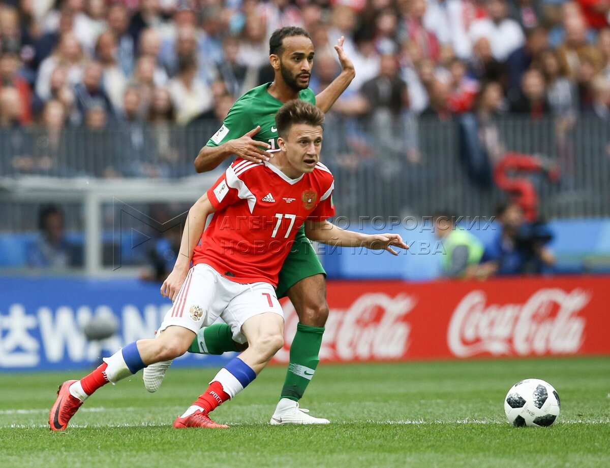 - Описание: Игрок сборной России Александр Головин (слева), игрок сборной Саудовской Аравии Усама Хаусави (справа) во время матча чемпионата мира по футболу 2018 г. между сборными России и Саудовской Аравии на стадионе «Лужники».Автор фото: Игорь Иванко