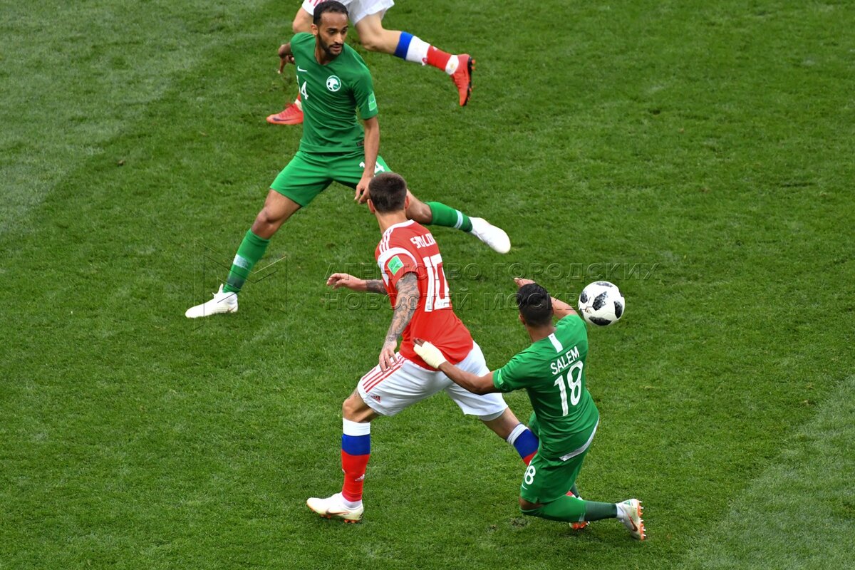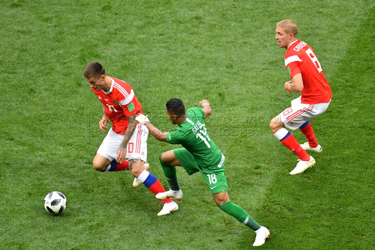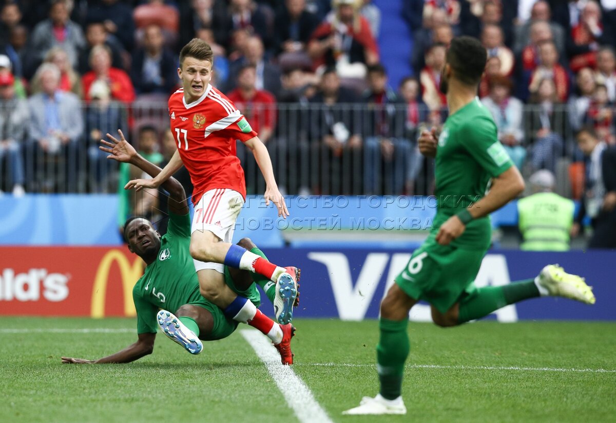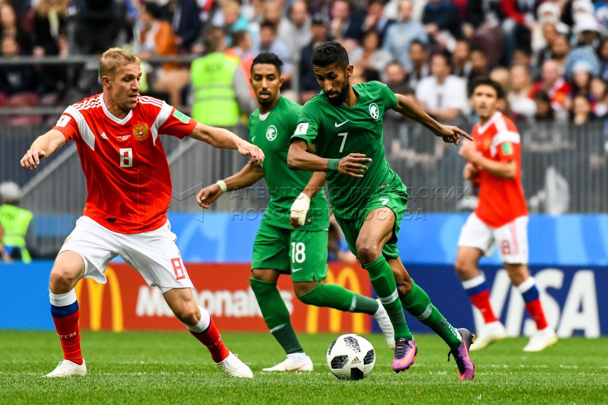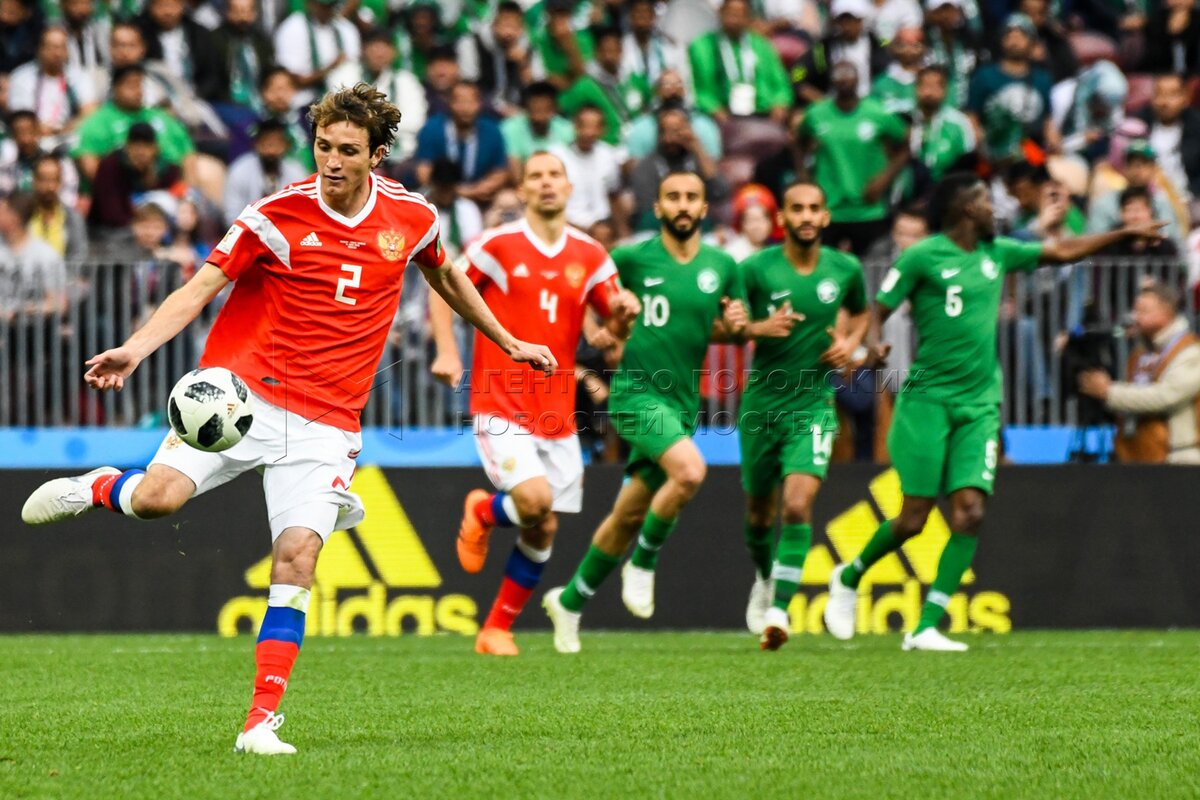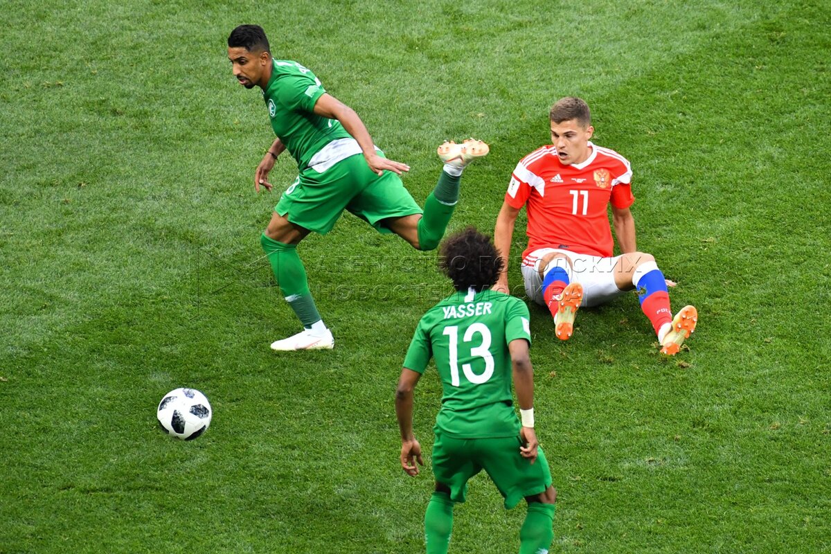 - Описание: Игрок сборной России Александр Головин (слева), игрок сборной Саудовской Аравии Усама Хаусави (справа) во время матча чемпионата мира по футболу 2018 г. между сборными России и Саудовской Аравии на стадионе «Лужники».Автор фото: Игорь Иванко