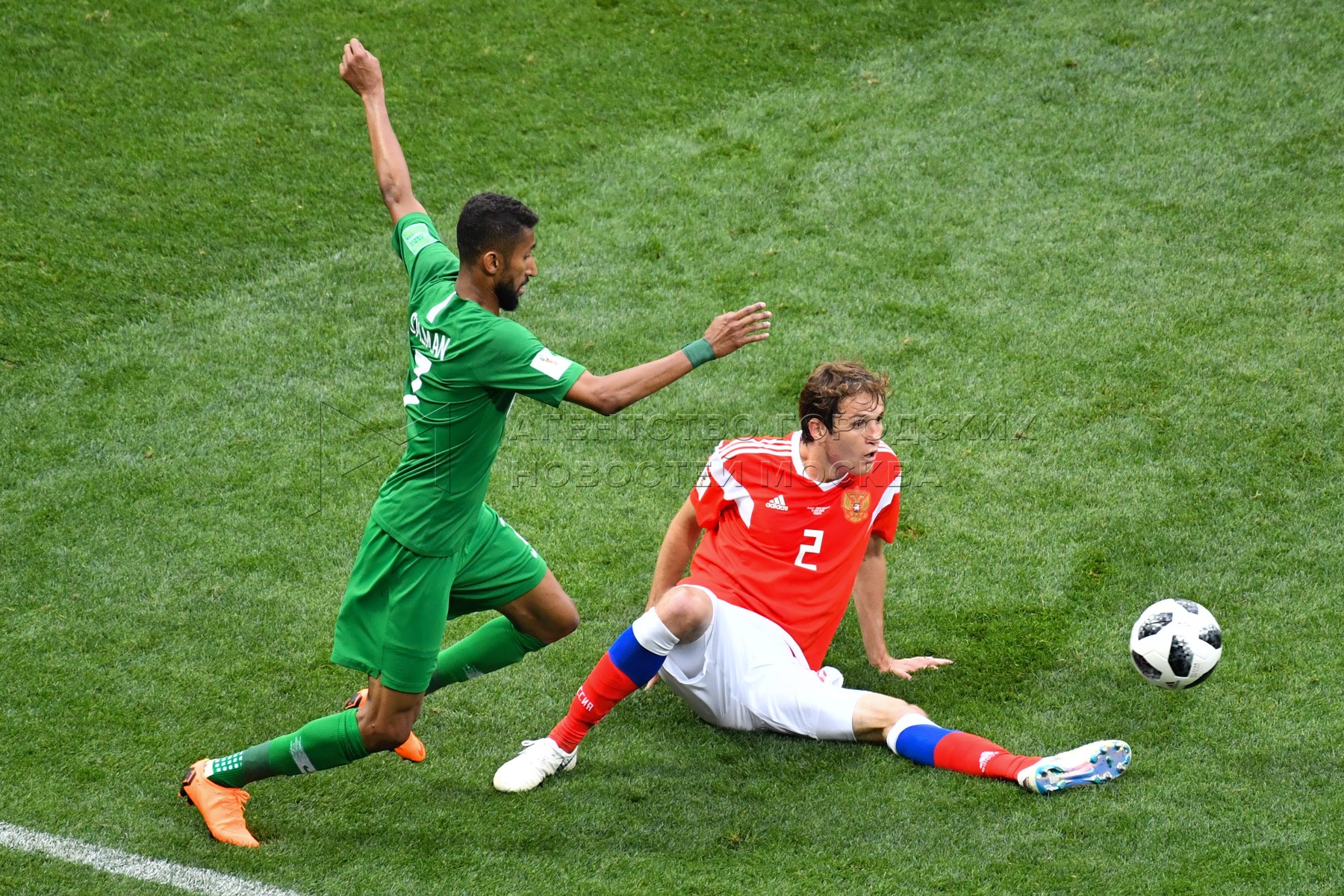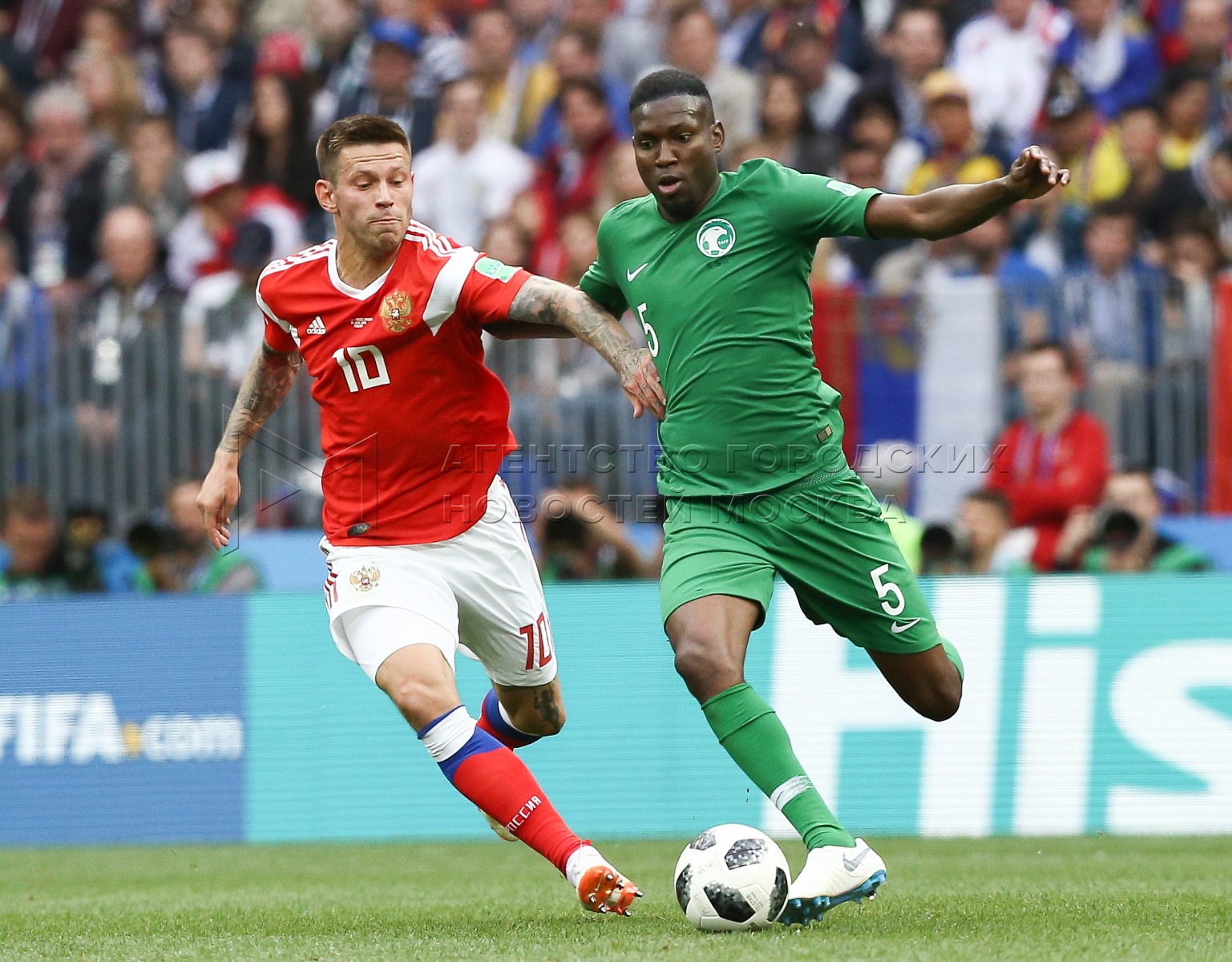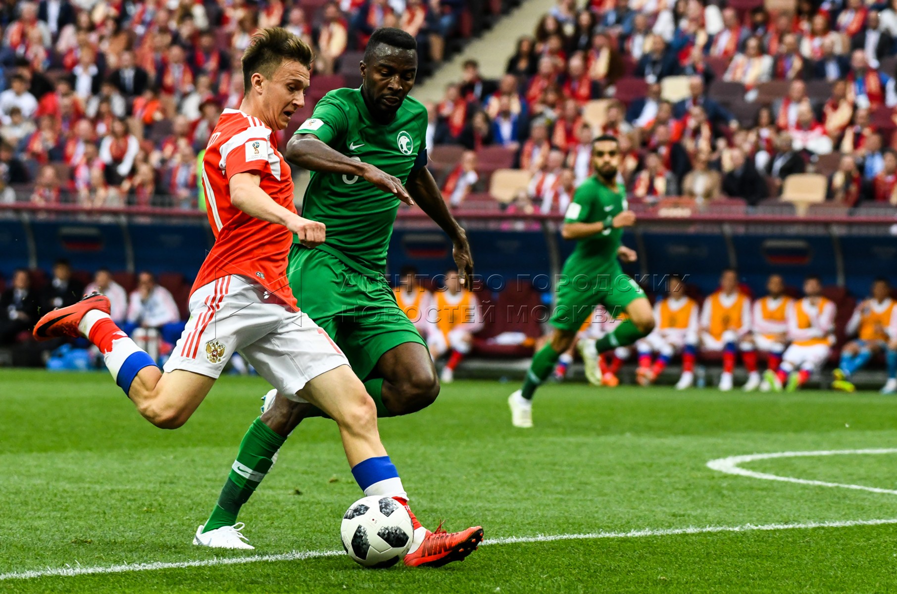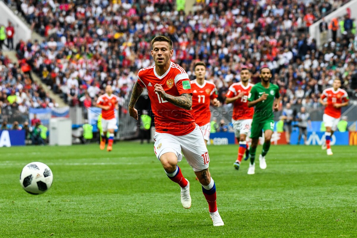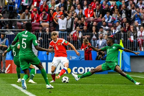 - Описание: Игрок сборной России Александр Головин (слева), игрок сборной Саудовской Аравии Усама Хаусави (справа) во время матча чемпионата мира по футболу 2018 г. между сборными России и Саудовской Аравии на стадионе «Лужники».Автор фото: Игорь Иванко