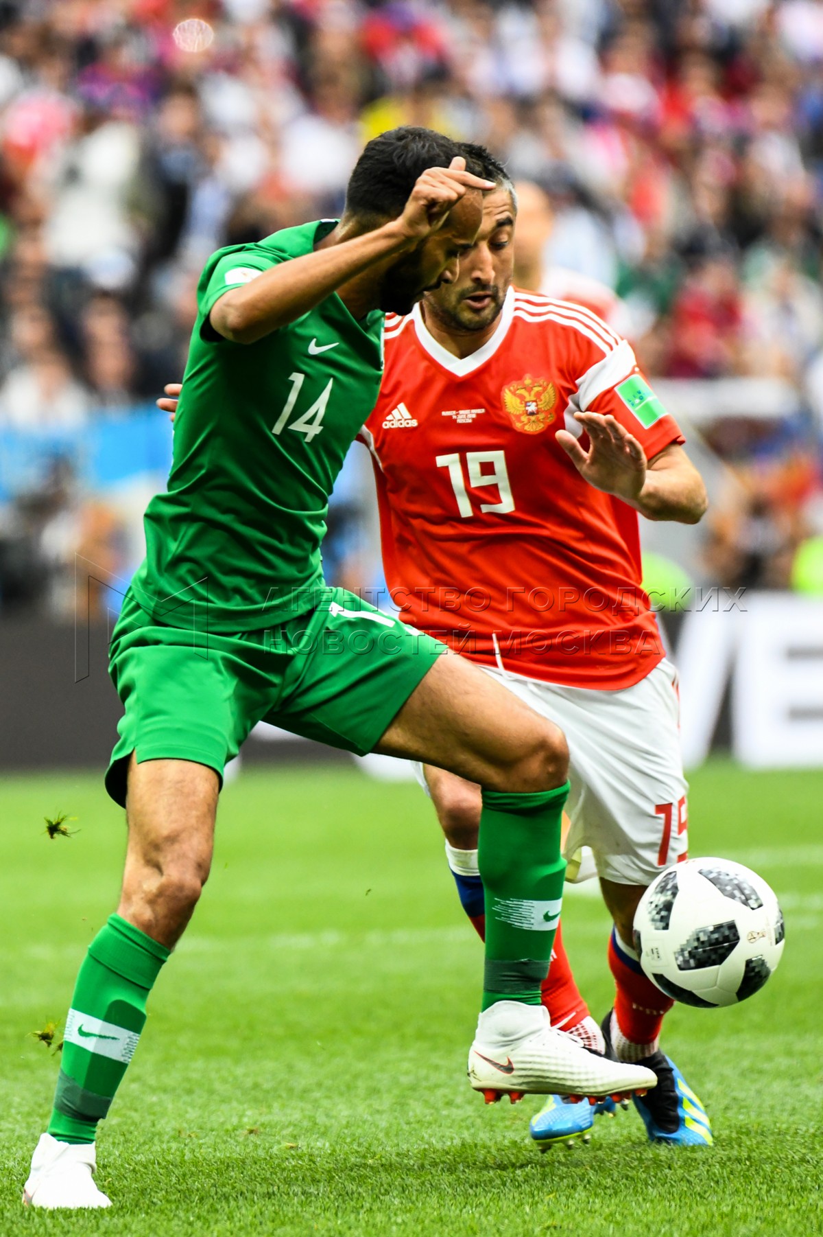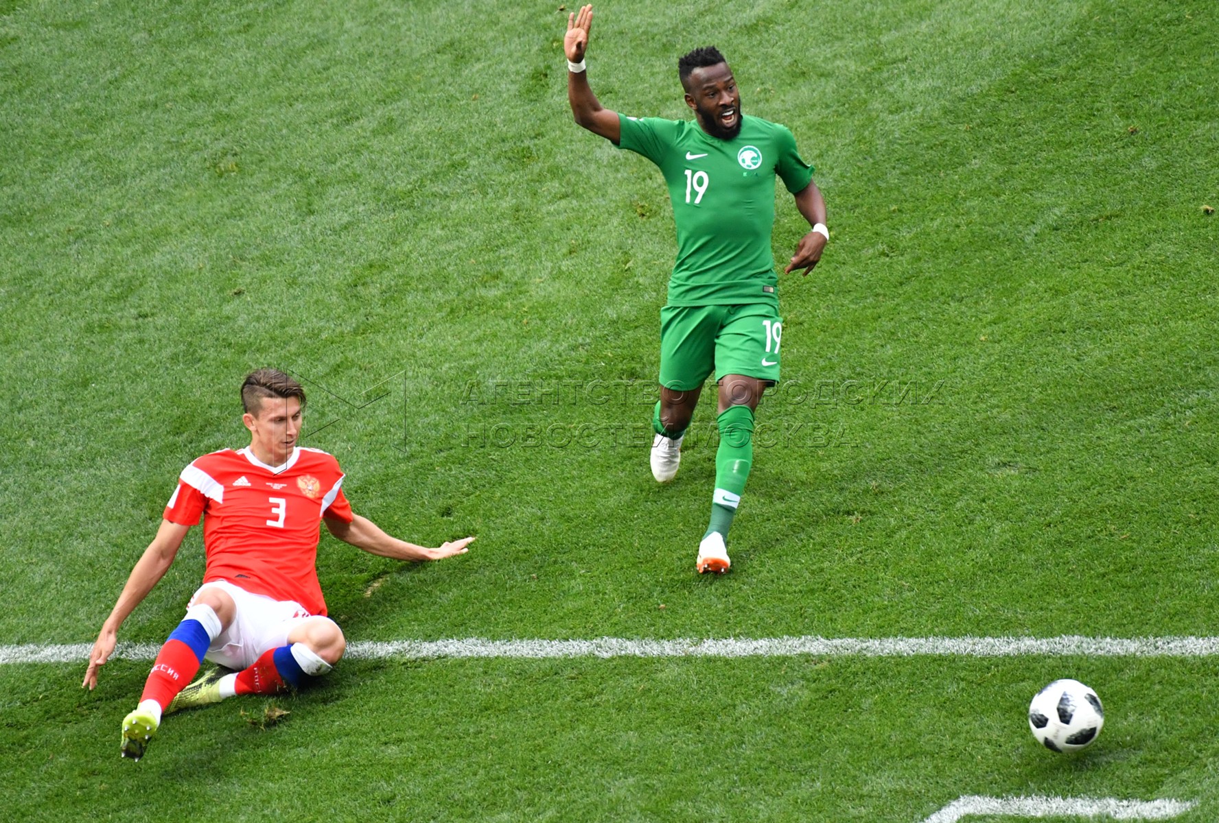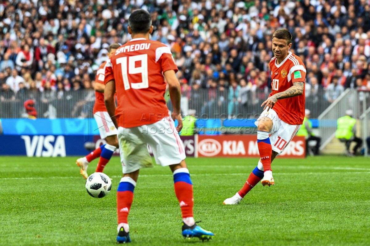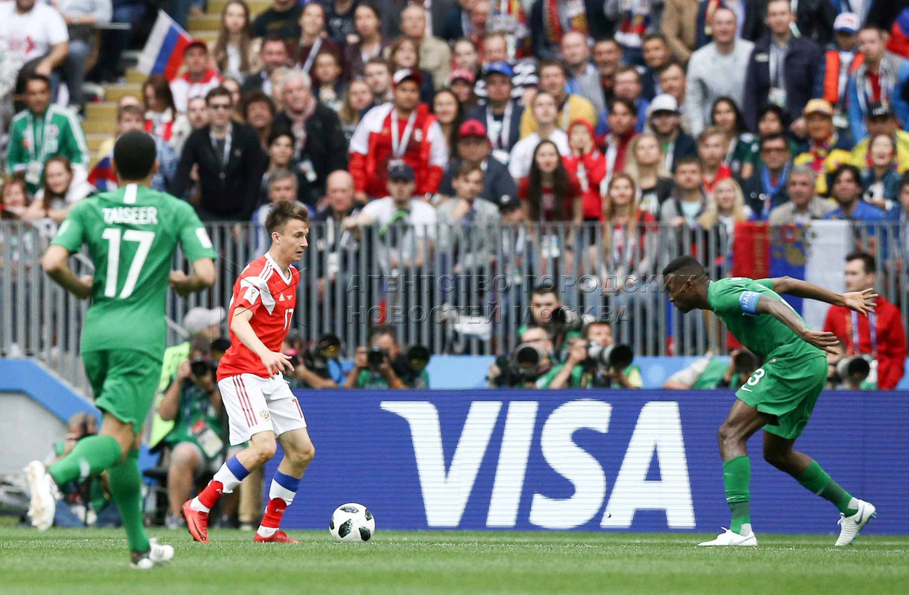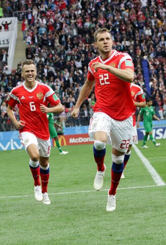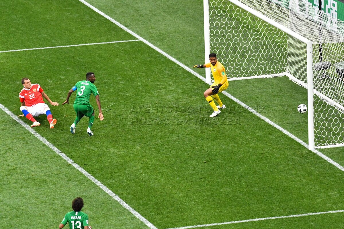 - Описание: Игрок сборной России Александр Головин (слева), игрок сборной Саудовской Аравии Усама Хаусави (справа) во время матча чемпионата мира по футболу 2018 г. между сборными России и Саудовской Аравии на стадионе «Лужники».Автор фото: Игорь Иванко
