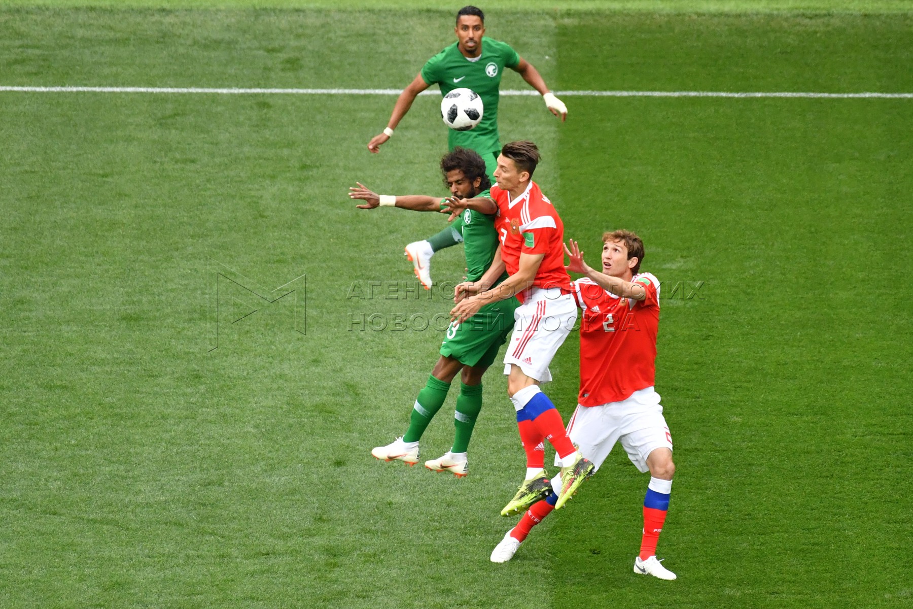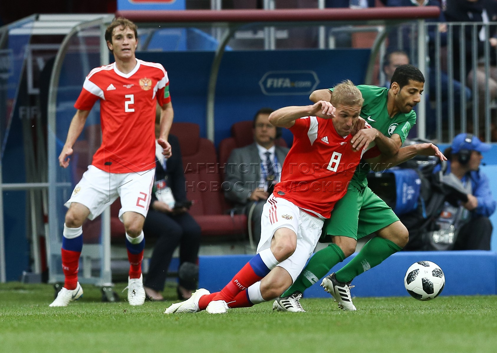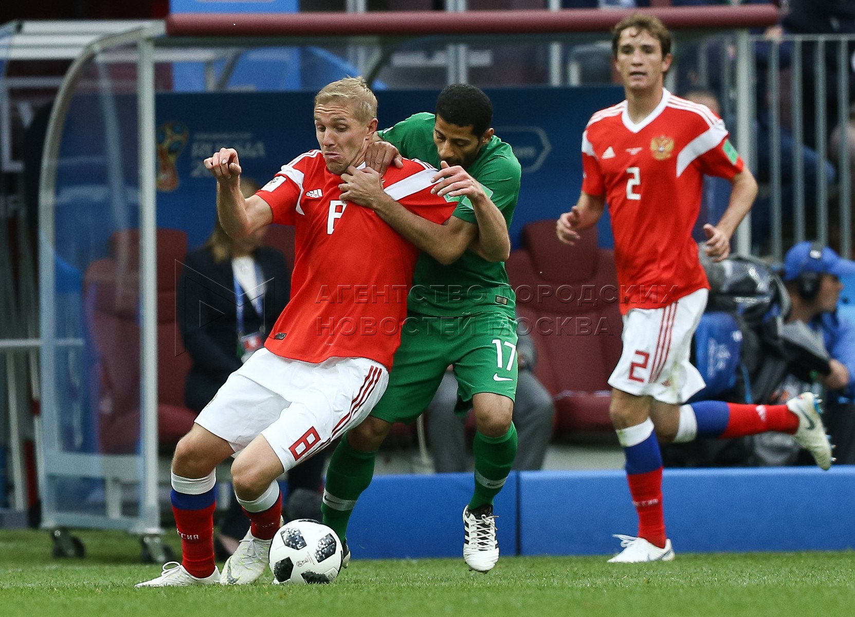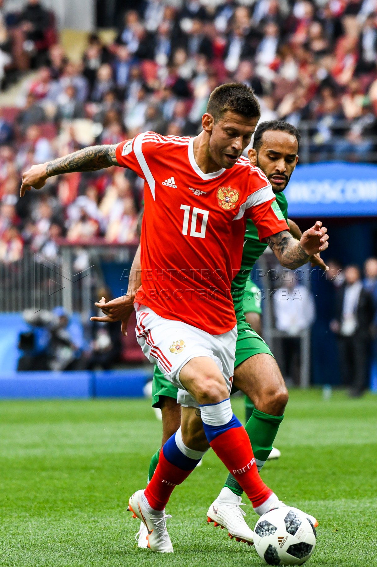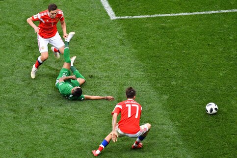 - Описание: Игрок сборной России Александр Головин (слева), игрок сборной Саудовской Аравии Усама Хаусави (справа) во время матча чемпионата мира по футболу 2018 г. между сборными России и Саудовской Аравии на стадионе «Лужники».Автор фото: Игорь Иванко