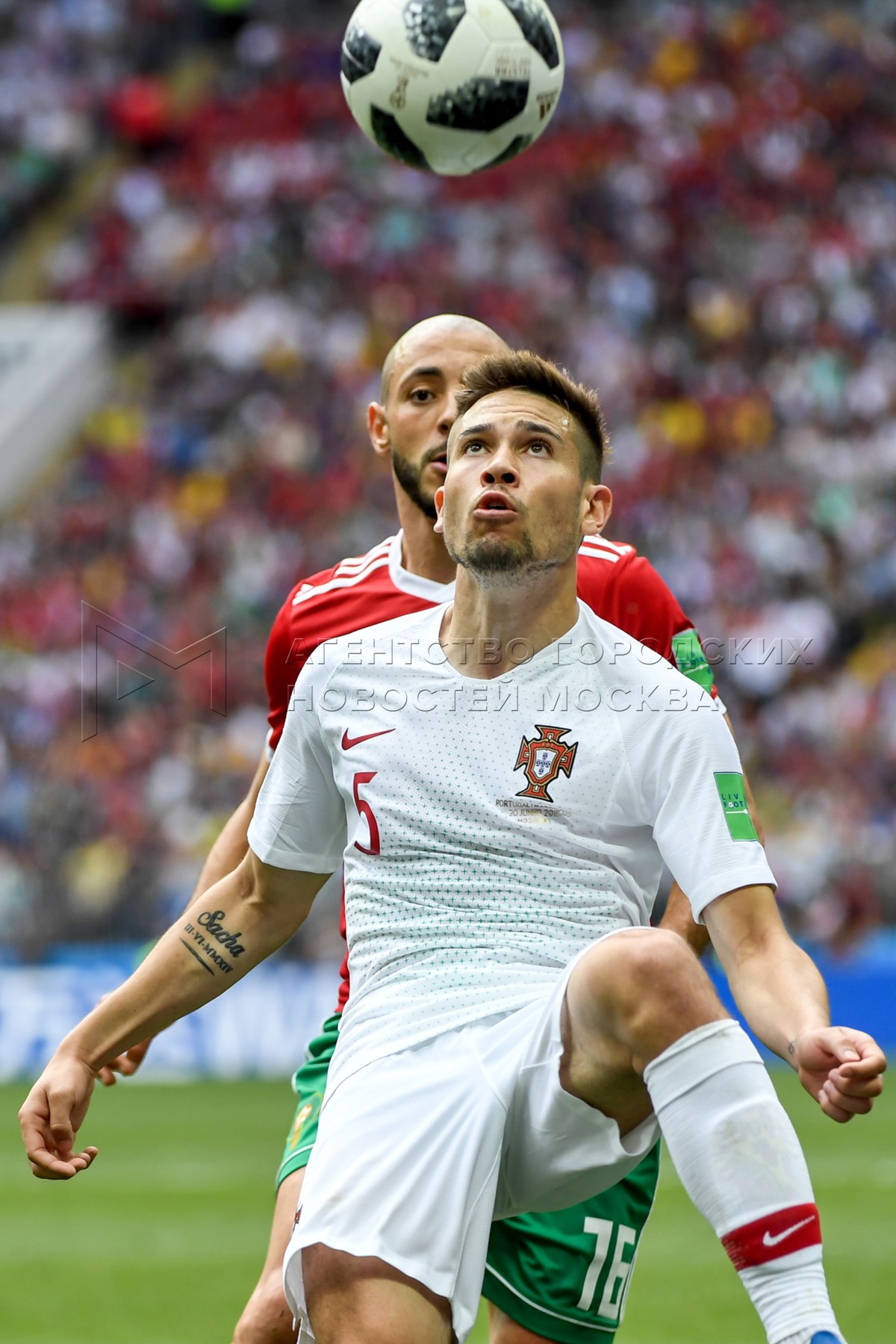 • Описание: Игрок сборной Марроко Карим аль-Ахмади (слева на заднем плане), игрок сборной Португалии Рафаэл Геррейро во время матча чемпионата мира по футболу 2018 г. между сборными Португалии и Марокко на стадионе «Лужники». Автор: Иванко Игорь.
