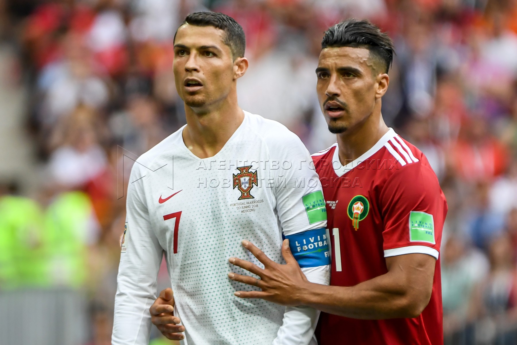 Слева направо - Криштиану Роналду (Португалия, 7) и Набиль Дирар (Марокко, 17) во время матча чемпионата мира по футболу 2018 г. между сборными Португалии и Марокко на стадионе «Лужники». Автор: Иванко Игорь.
