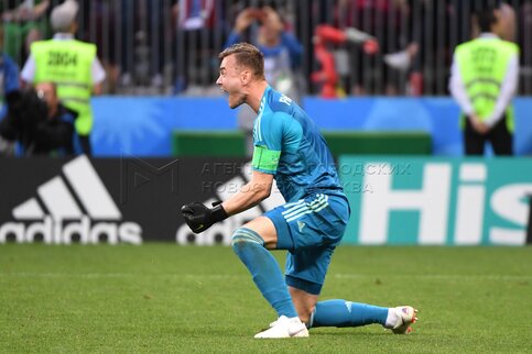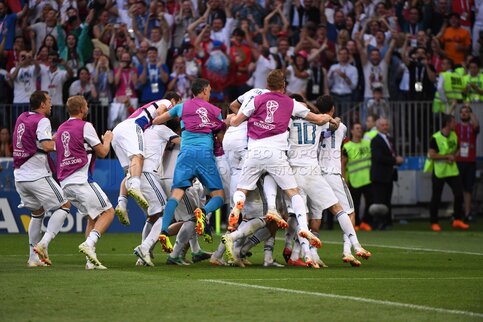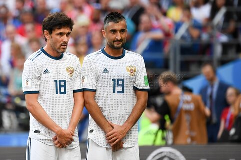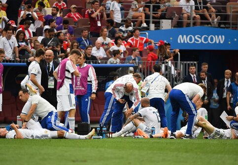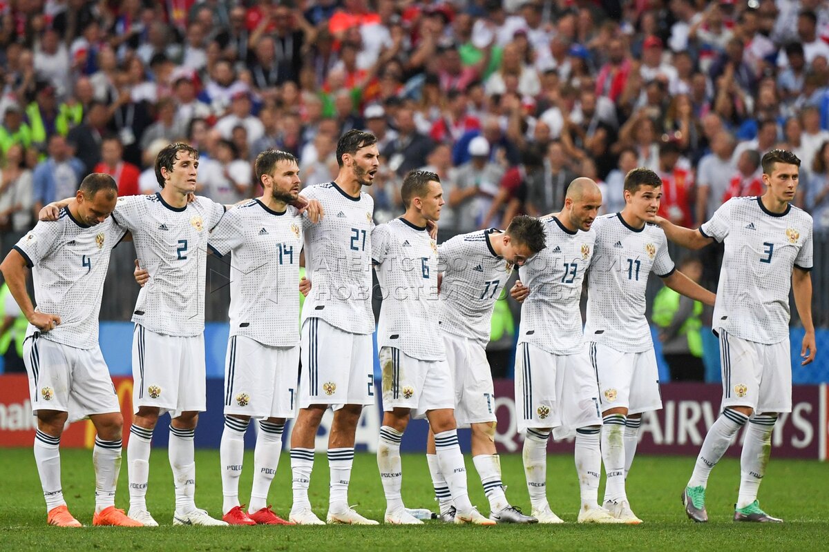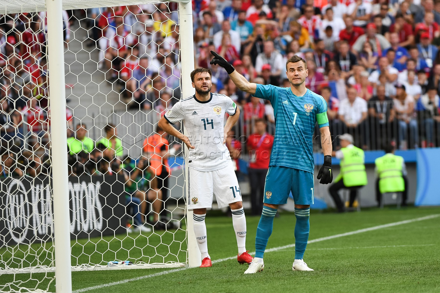 - Описание: Игроки сборной России перед началом матча со сборной Испании в 1/8 финала чемпионата мира по футболу 2018 г. на стадионе «Лужники». Автор фото: Никеричев Андрей.