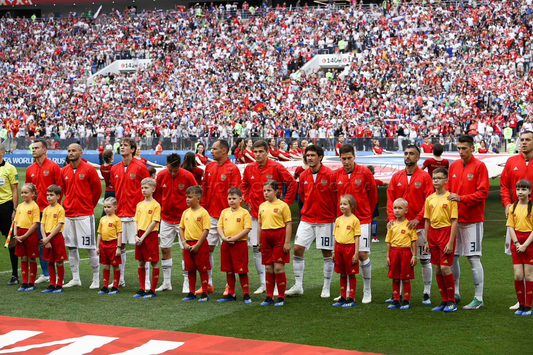Игроки сборной России перед началом матча со сборной Испании в 1/8 финала чемпионата мира по футболу 2018 г. на стадионе «Лужники». Автор фото: Никеричев Андрей.