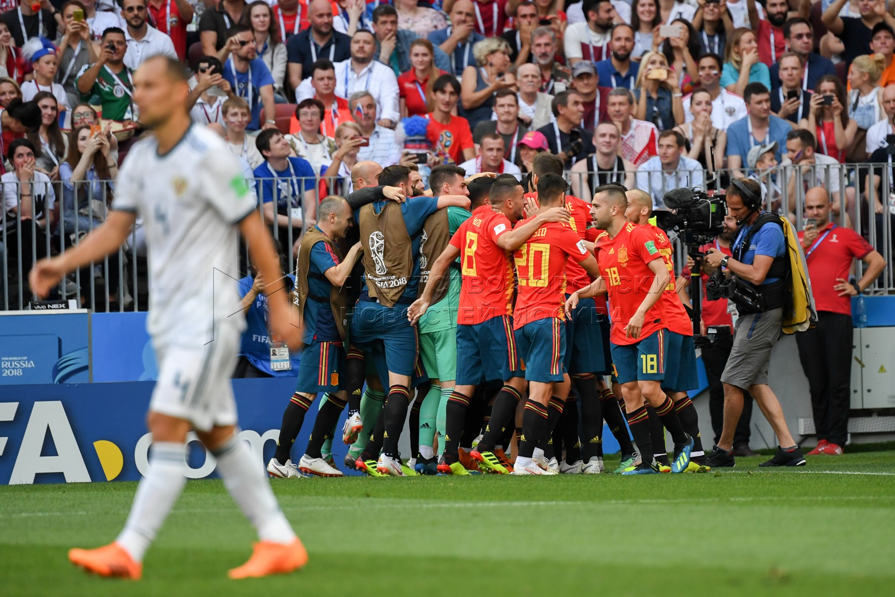 Игроки сборной Испании празднуют забитый гол в ворота сборной России во время матча 1/8 финала чемпионата мира по футболу 2018 г. на стадионе «Лужники». Автор фото: Иванко Игорь.