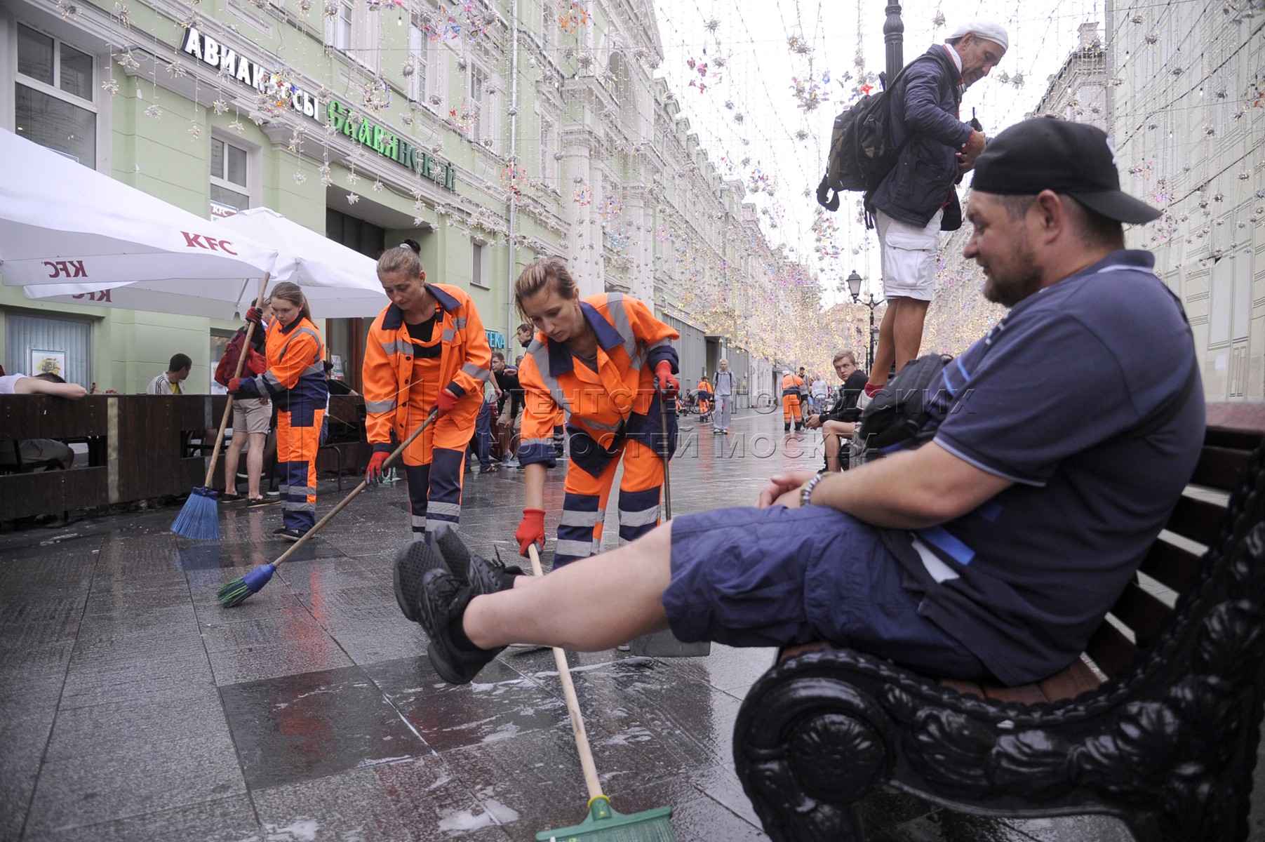 • Описание: Уборка в центре столицы после празднования болельщиками победы сборной России в матче с Испанией на ЧМ-2018. Автор: Авилов Александр.