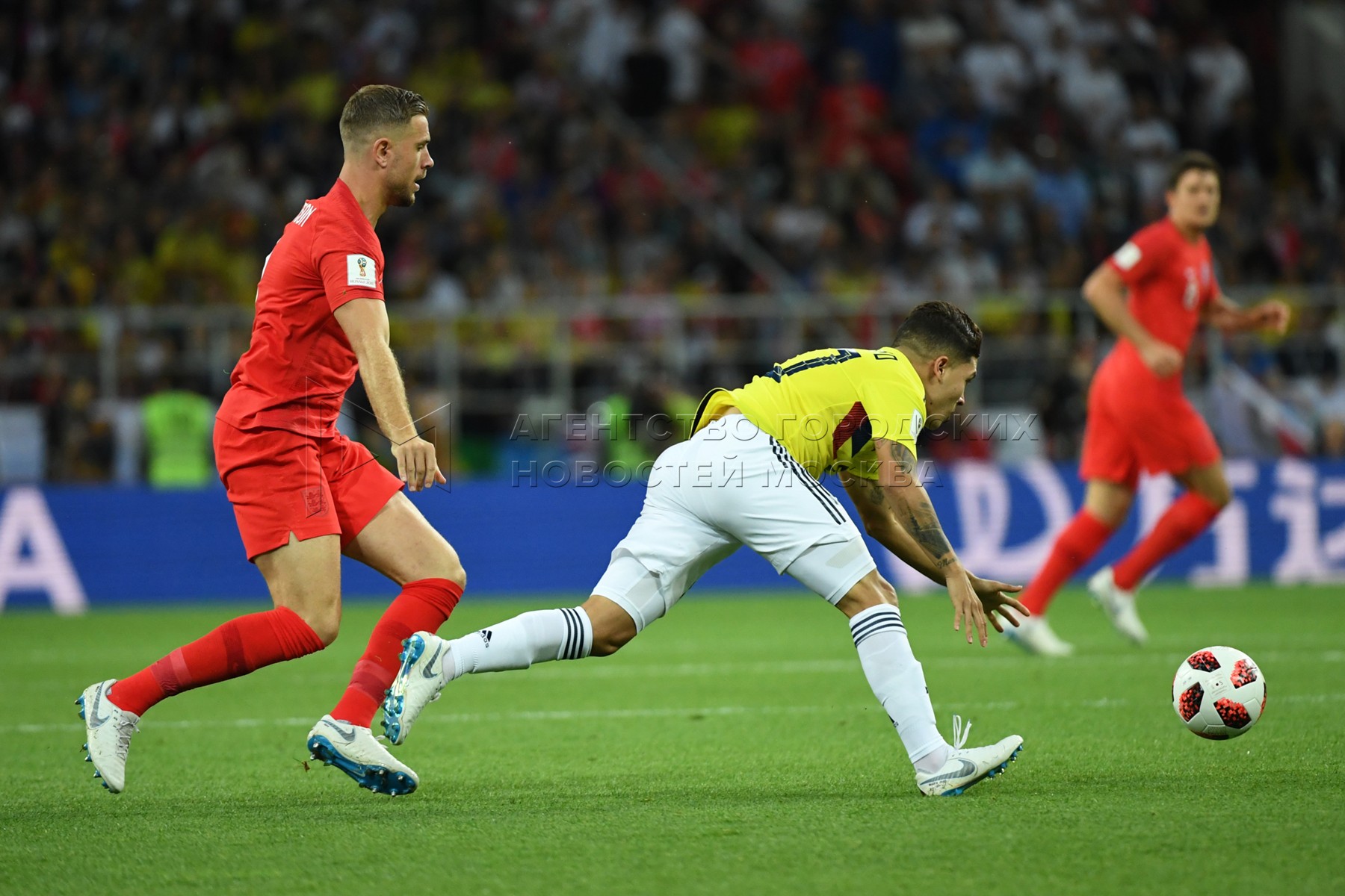 Слева направо - Джордан Хендерсон (Англия, 8), Хуан Кинтеро (Колумбия, 20) во время матча 1/8 финала чемпионата мира по футболу 2018 г. между сборными Колумбии и Англии на стадионе «Спартак». Автор: Никеричев Андрей.