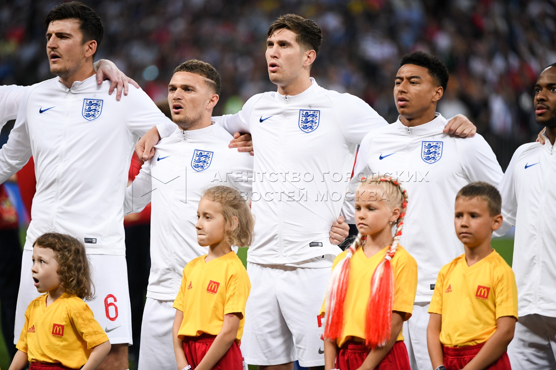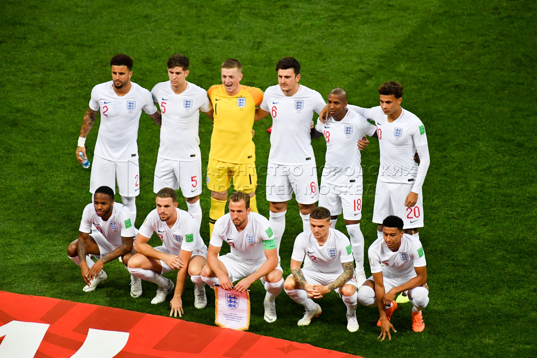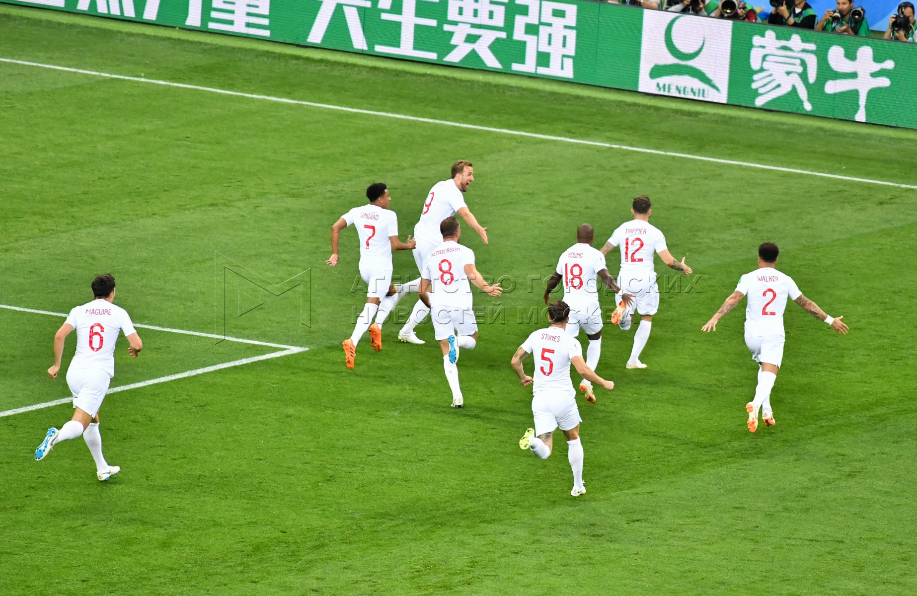 Игроки сборной Англии во время матча ЧМ-2018 между сборными Хорватии и Англии на...