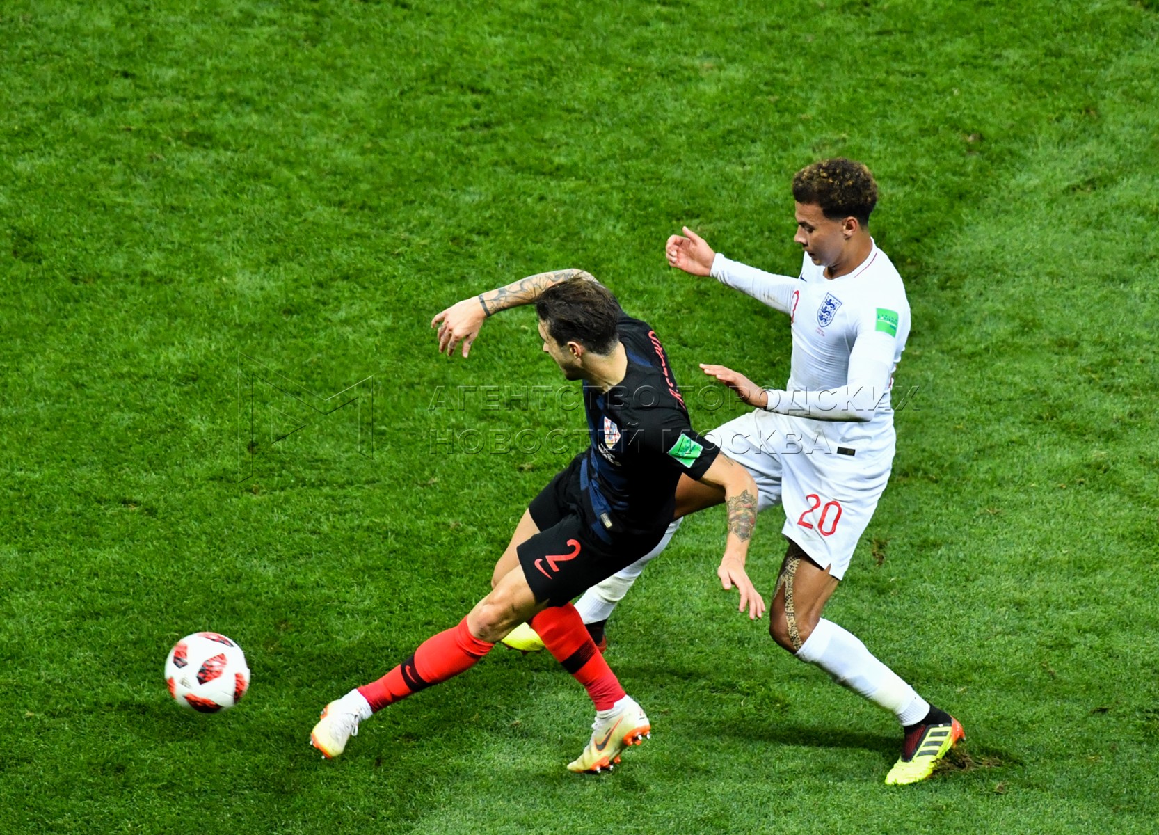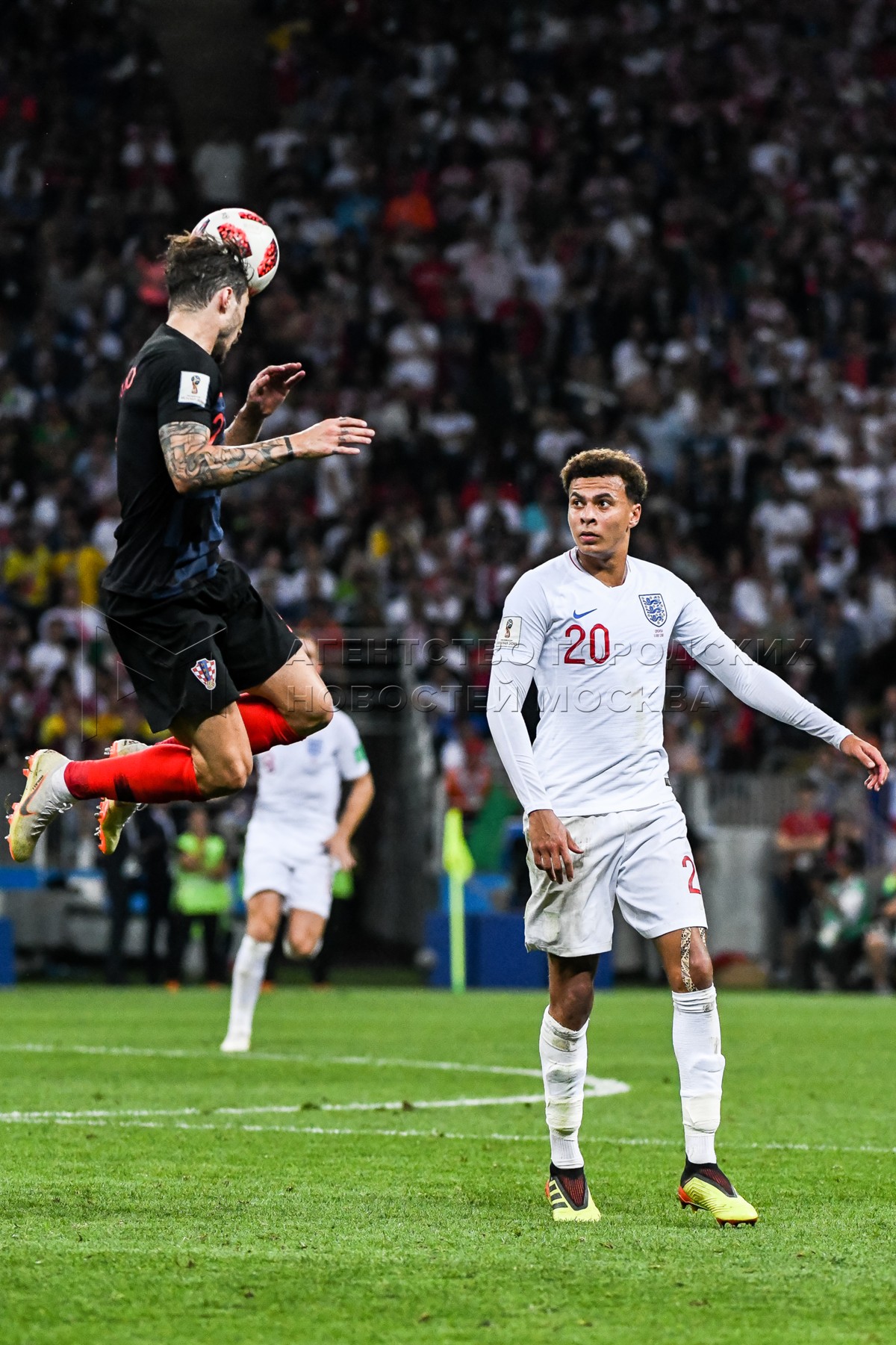 Игрок сборной Англии Деле Алли (слева), игрок сборной Хорватии Анте Ребич (в цент...