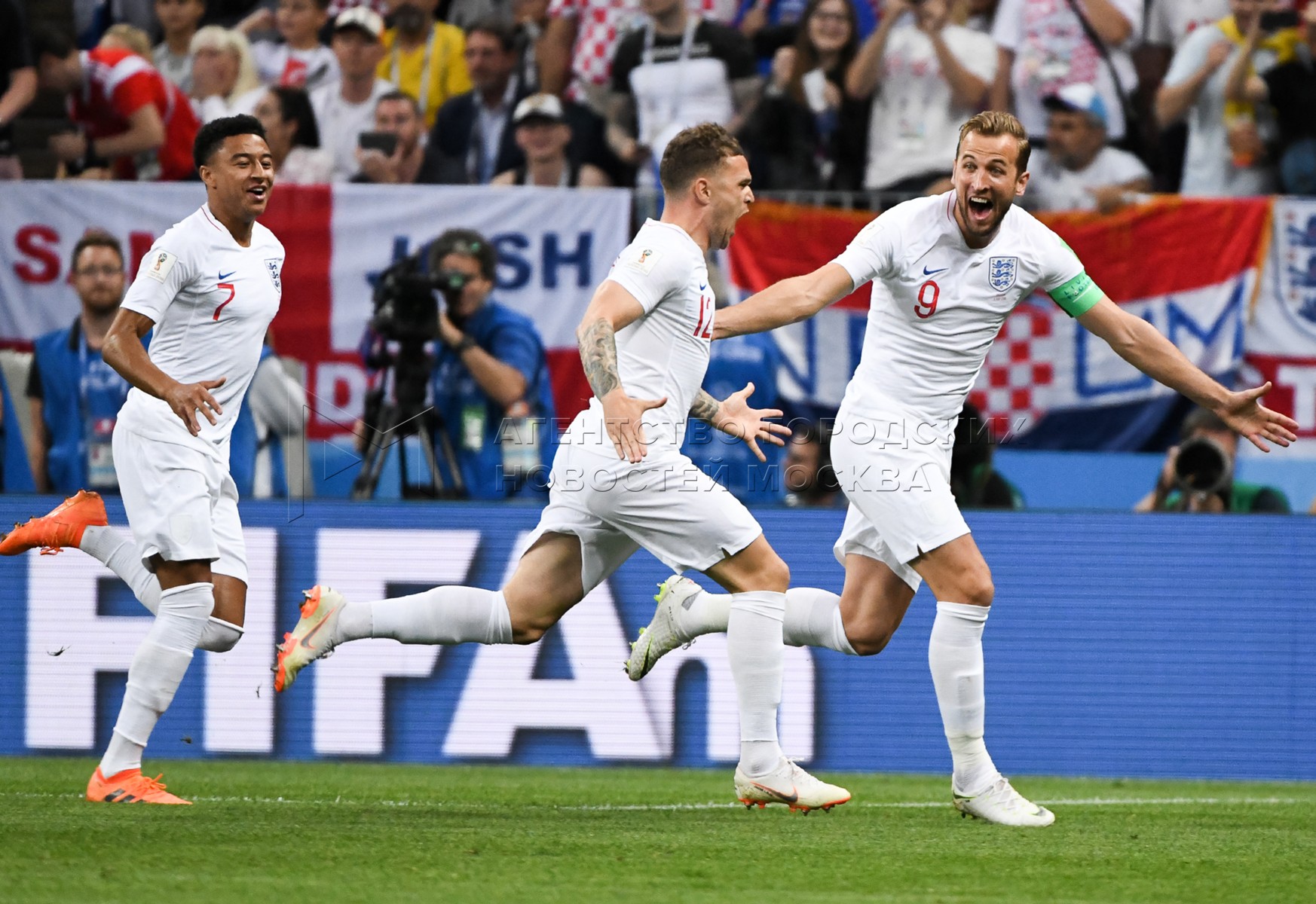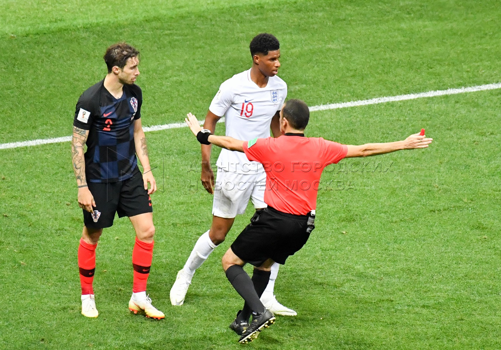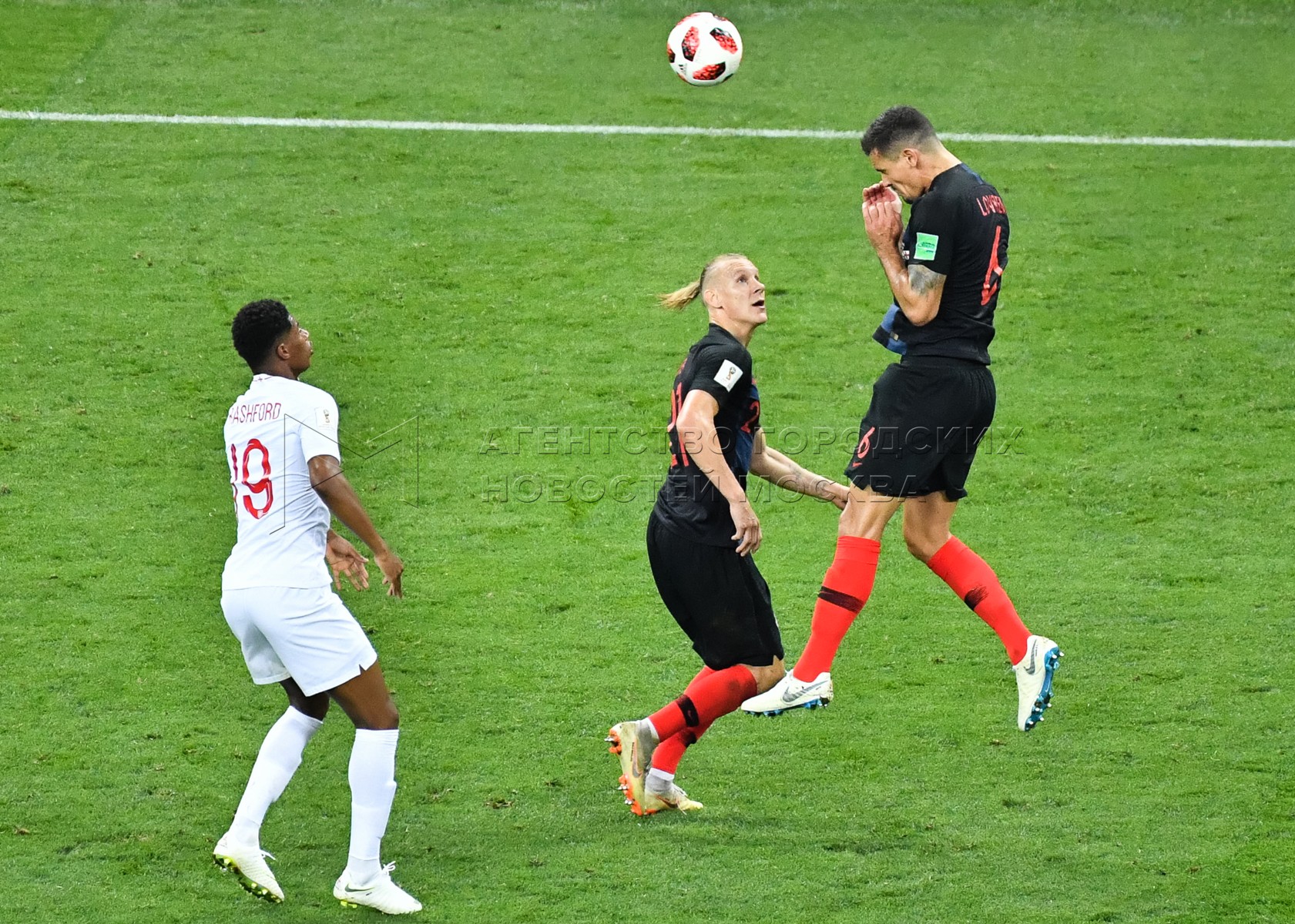 Игрок сборной Англии Джесси Лингард (в центре), игрок сборной Хорватии Марцело Бр...
