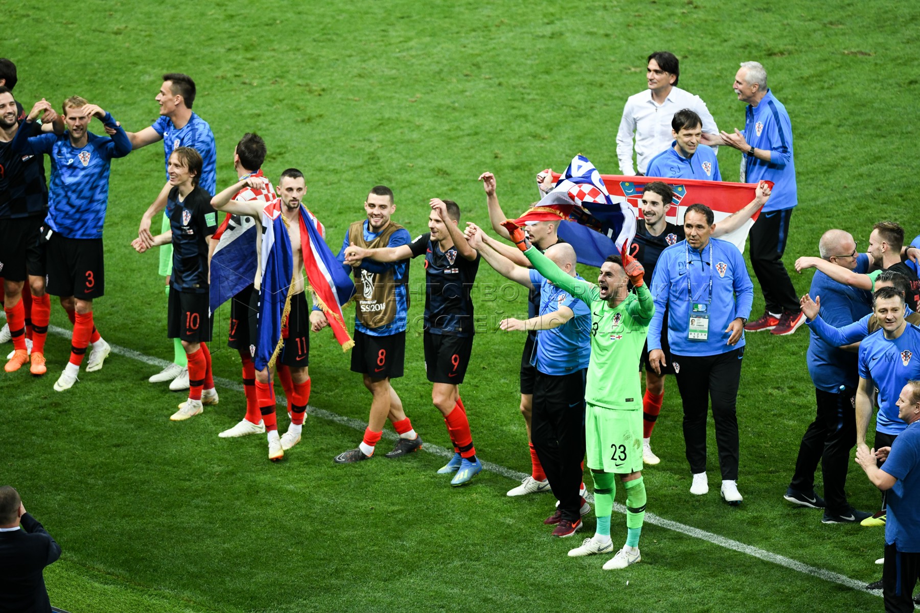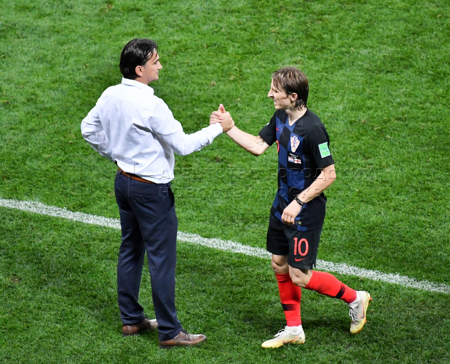 • Описание: Главный тренер сборной Хорватии Златко Далич, игрок сборной Хорватии Лука Модрич (слева направо) во время матча ЧМ-2018 между сборными Хорватии и Англии на стадионе «Лужники». Автор фото: Сергей Киселев.