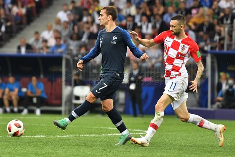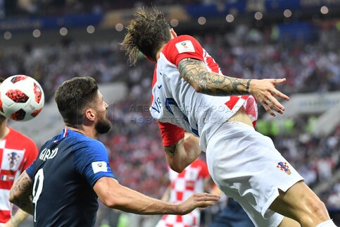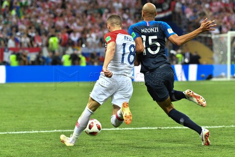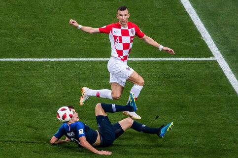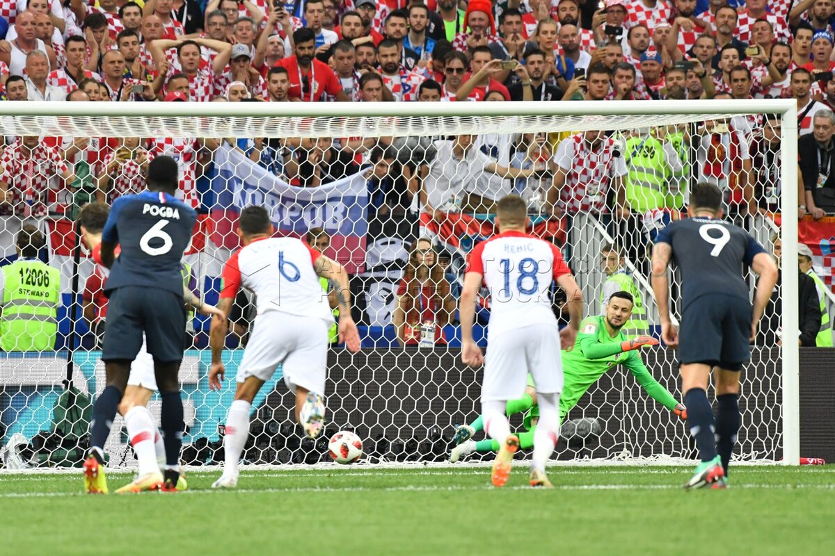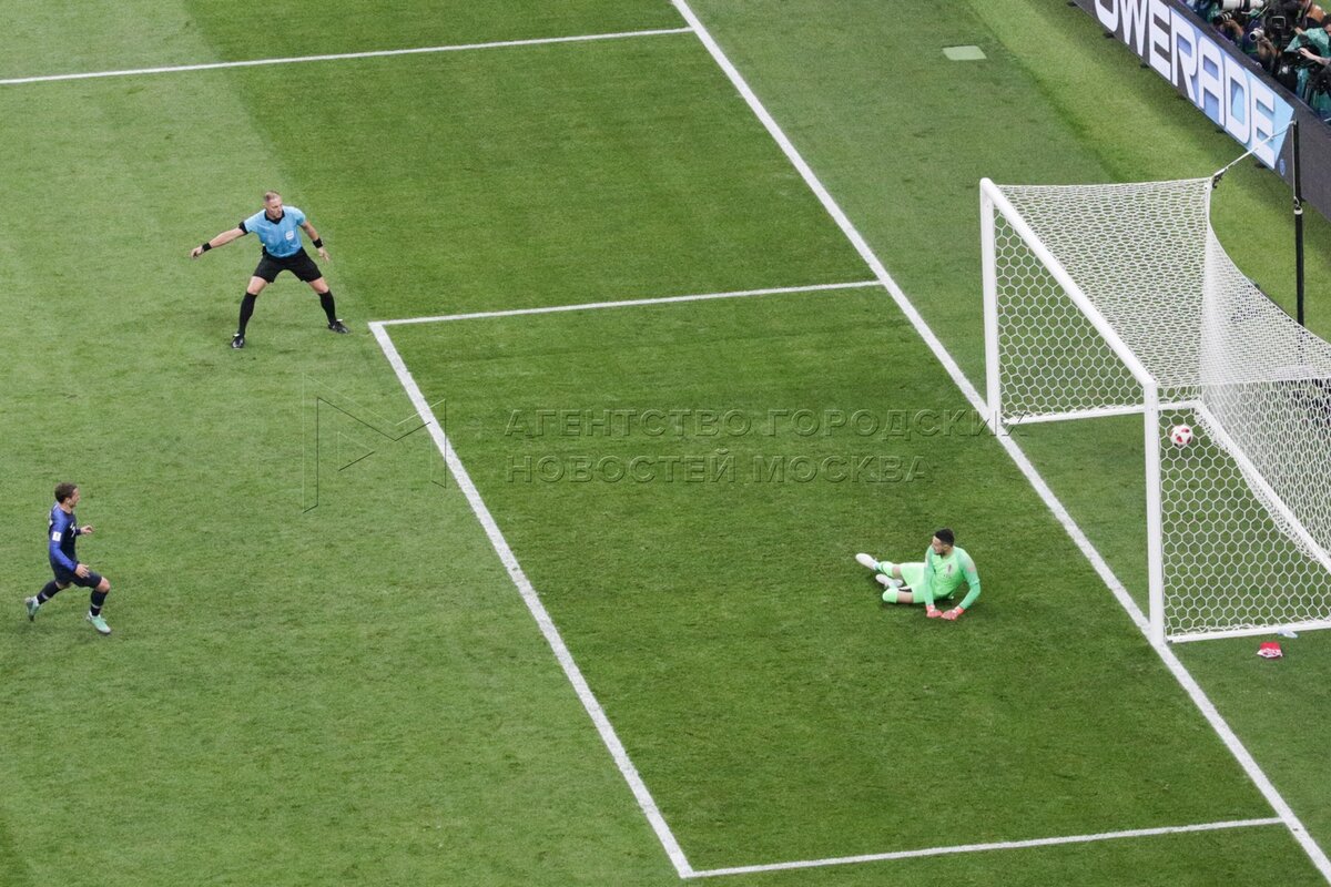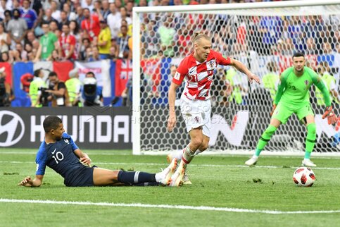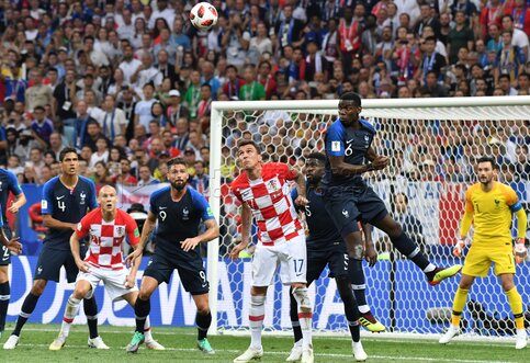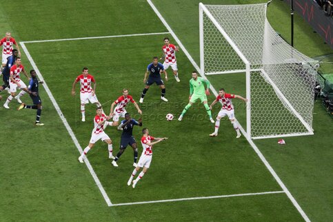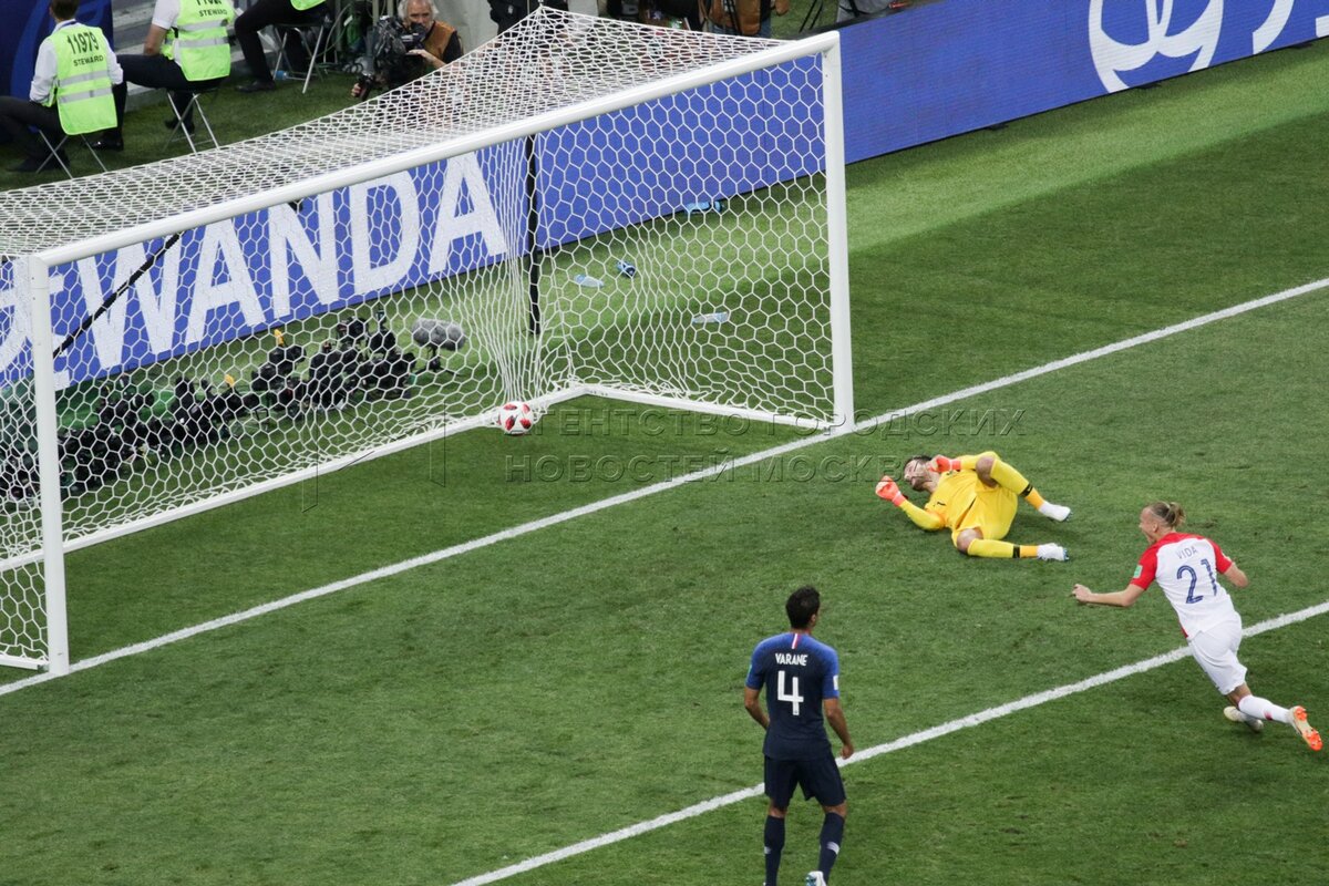 - Описание: Игроки слева направо - Марио Манджукич (Хорватия, 17), вратарь Уго Льорис (Франция, 1) во время финального матча чемпионата мира по футболу 2018 г. между сборными Франции и Хорватии на стадионе «Лужники». Автор фото: Сергей Киселев.