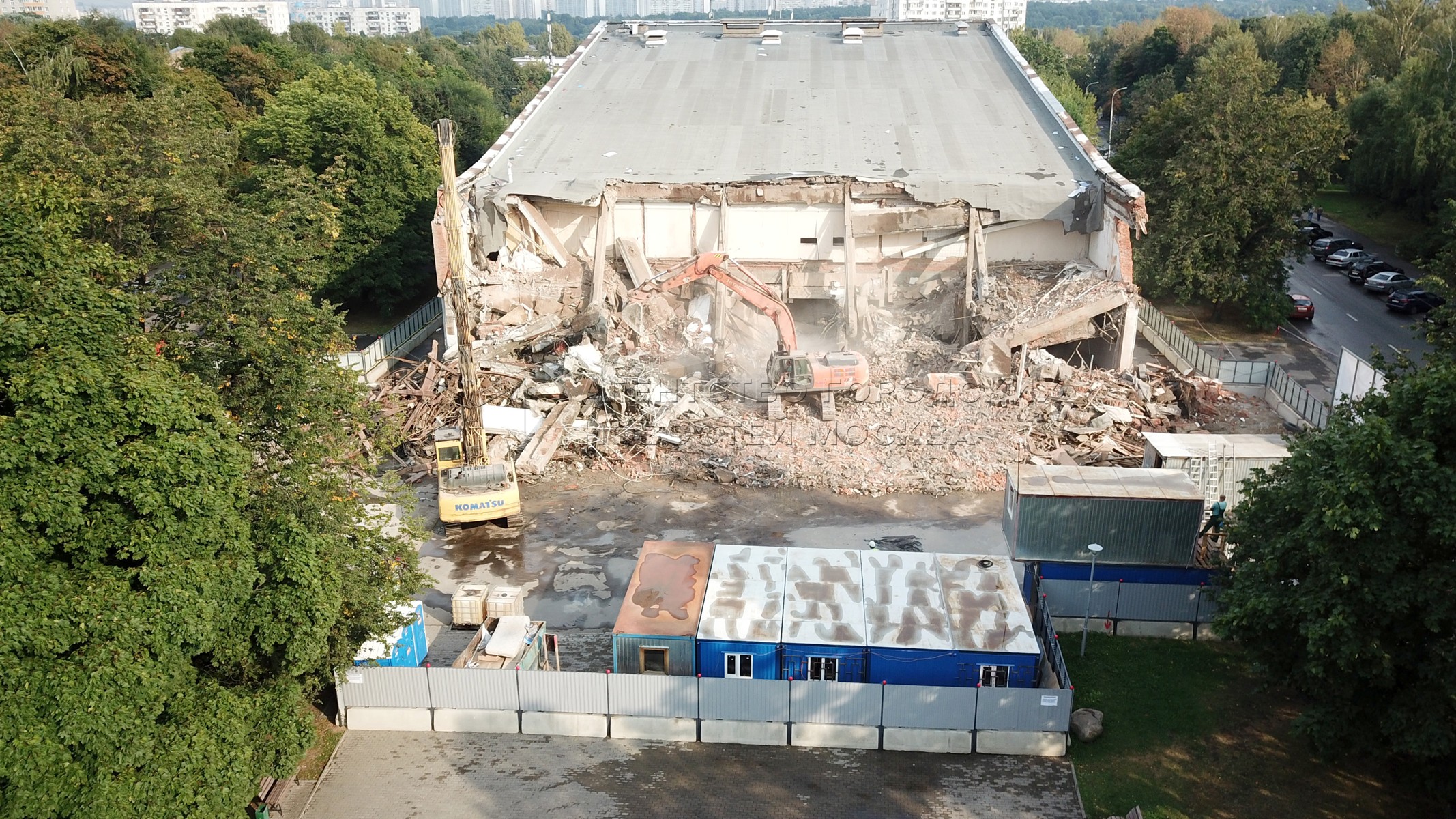 Cнос старого здания кинотеатра «Эльбрус» на Кавказском бульваре, входящего в городскую программу по реконструкции советских кинотеатров.