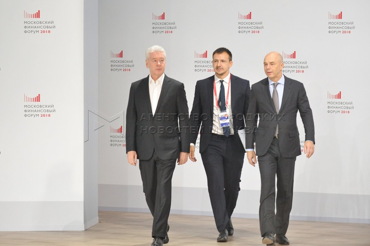 Сергей Собянин (слева), первый заместитель председателя правительства РФ, министр финансов Антон Силуанов (справа) на Московском финансовом форуме - 2018.