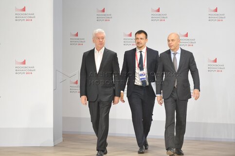 • Описание: Сергей Собянин (слева), первый заместитель председателя правительства РФ, министр финансов Антон Силуанов (справа) на Московском финансовом форуме - 2018.