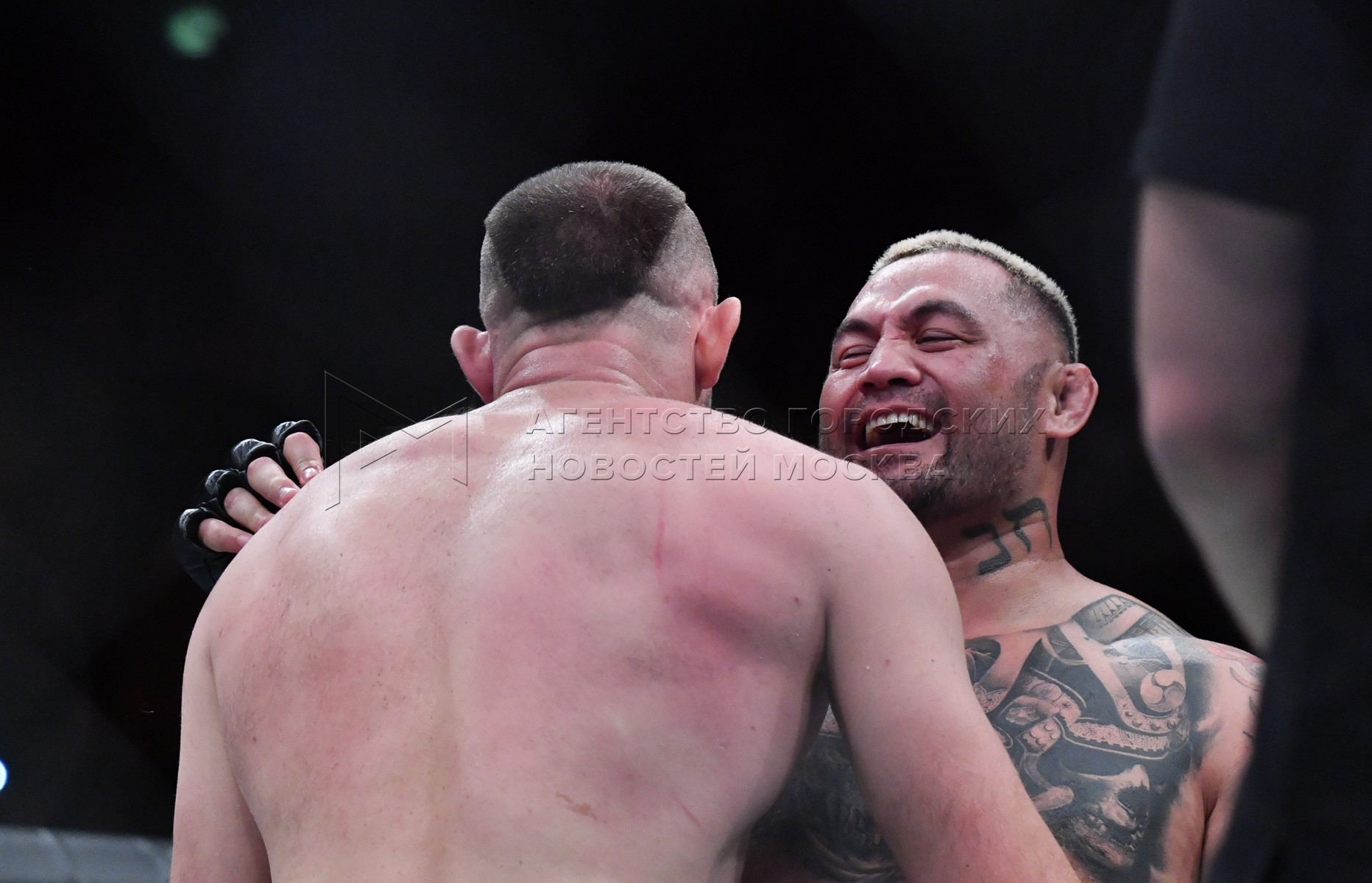 Боец Алексей Олейник (Россия) (справа) после поединка в рамках турнира UFC Fight ...
