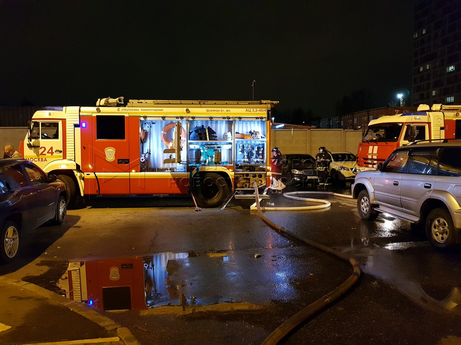 • Заголовок: Пожарные у высотного дома на юге Москвы, где произошло возгорание в квартире на 19 этаже