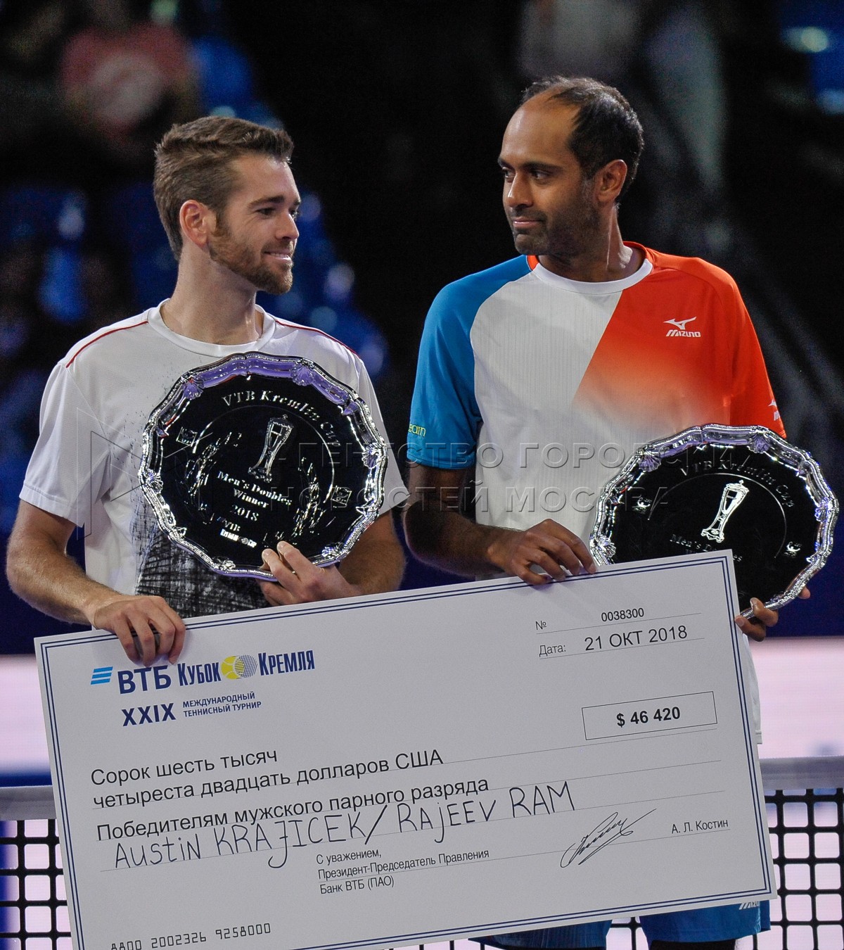 • Описание: Аустин Крайчек (США) (слева) и Раджив Рам (США), победившие в финальном матче парного разряда среди мужчин на турнире «ВТБ Кубок Кремля», на церемонии награждения в СК «Олимпийский» в Москве.