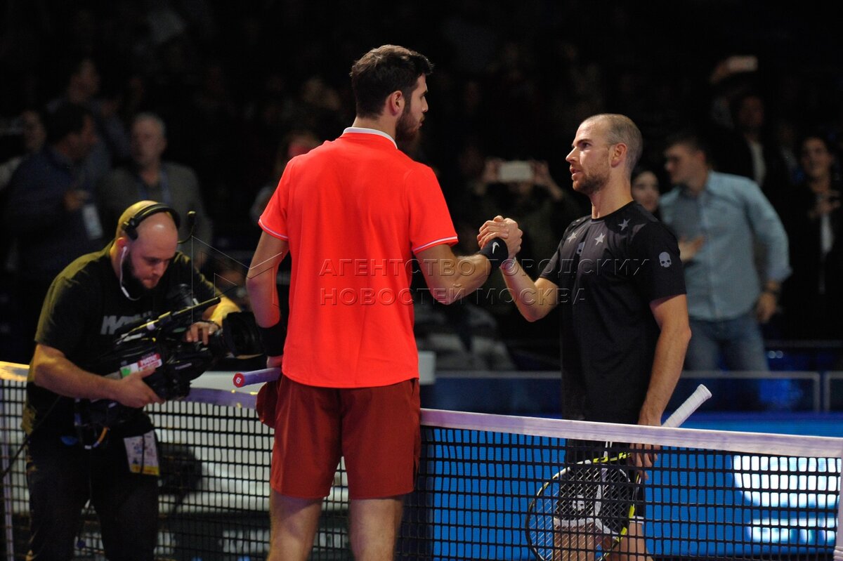 Карен Хачанов (Россия) и Адриан Маннарино (Франция) в финальном матче одиночного разряда среди мужчин на турнире «ВТБ Кубок Кремля» против Карена Хачанова (Россия) в СК «Олимпийский» в Москве.