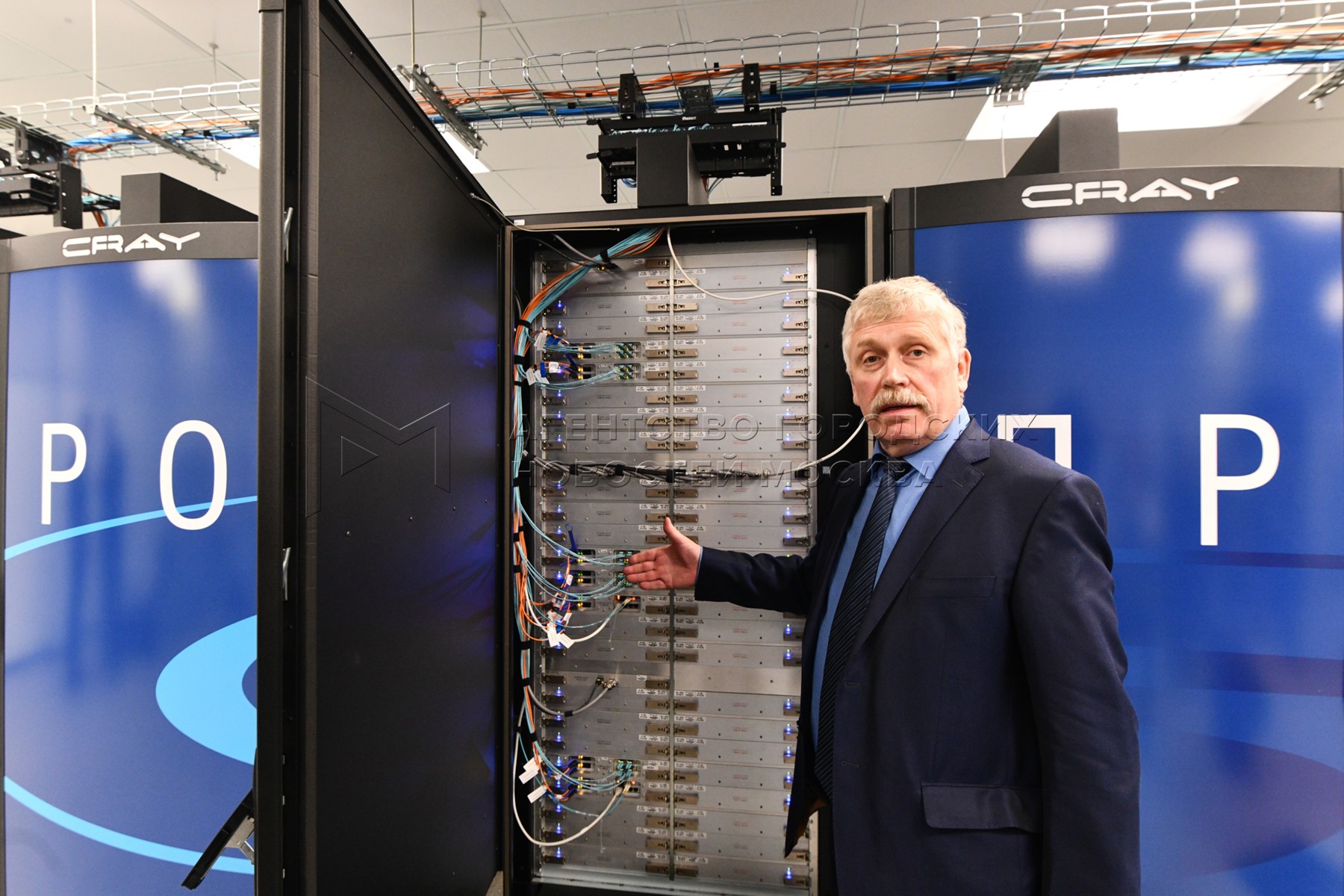 • Описание: Директор Федеральной службы по гидрометеорологии и мониторингу окружающей среды (Росгидромет) Сергей Лубов во время презентации высокопроизводительного вычислительного кластера Росгидромета.