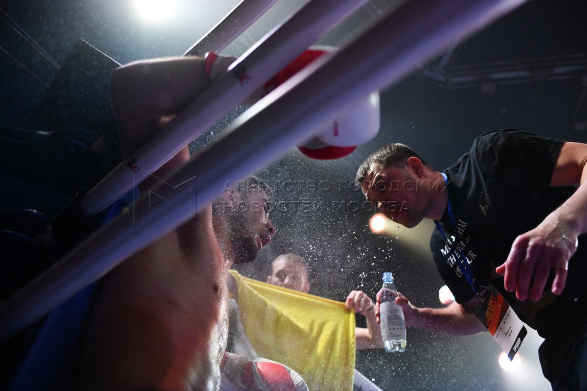 Боксеры Абдулмалик Мугидинов (Москва), Андрей Хромов (Кемеровская обл) (слева направо) во время турнира по профессиональному тайскому боксу MuayThai Moscow 2 в УСК «Крылья Советов».