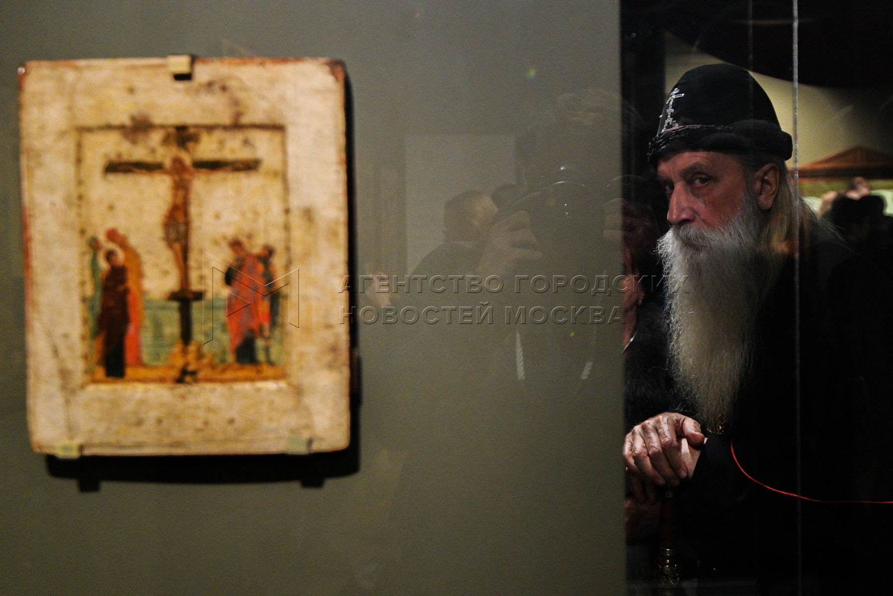 Автор: Иванко Игорь. Древнейший моленный образ, принадлежавший Анне Мараевой – византийская икона «Распятие» XIV века на открытии выставки «Сокровище вечное. Церковные древности из собрания Анны Мараевой» в Музее русской иконы.