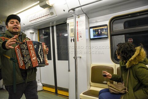 Трансляция поздравления президента России на экранах в вагонах поездов Московсков...