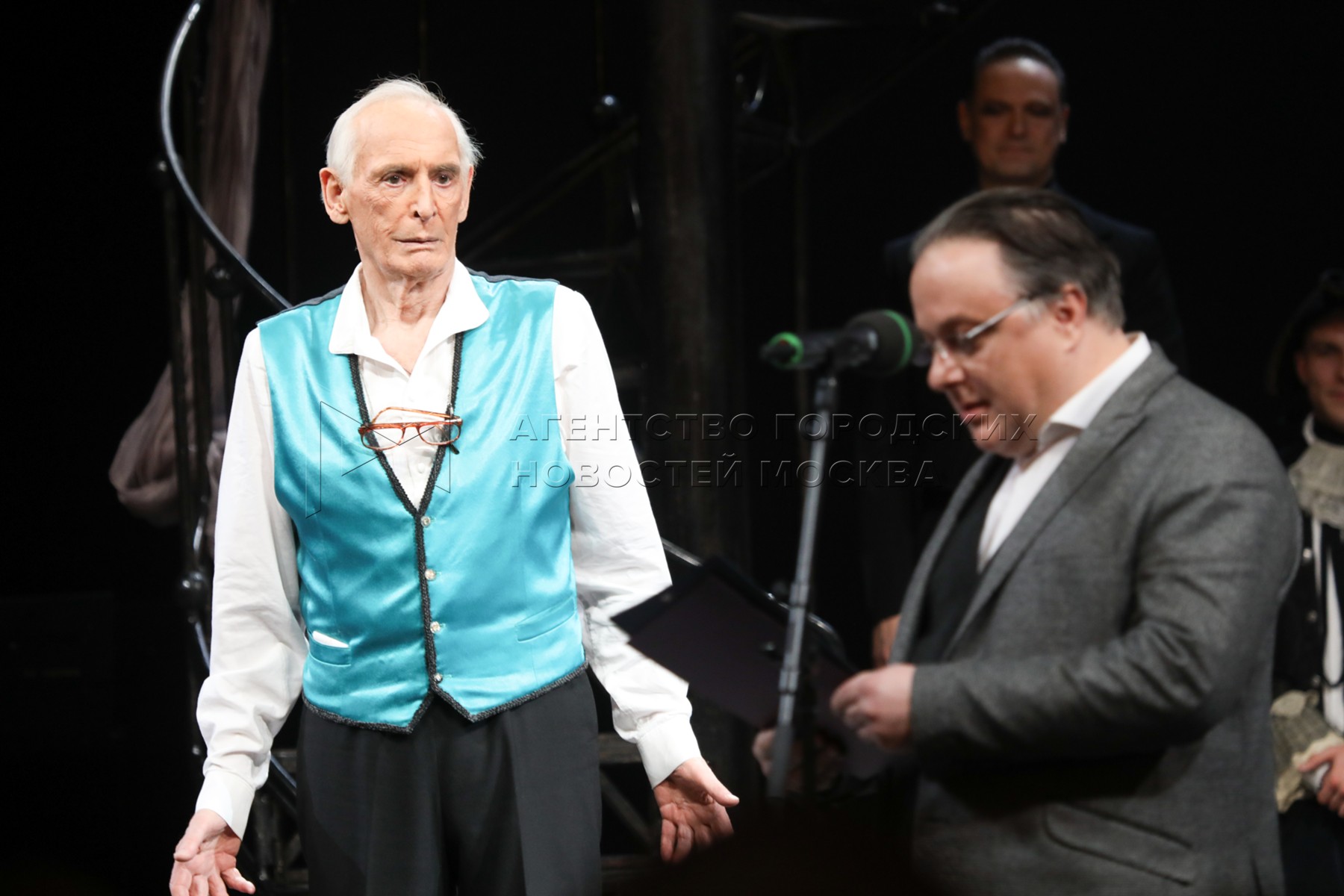 - Описание: Народный артист СССР Василий Лановой (слева) принимает поздравления к своему 85-летию от директора театра им. Е.Вахтангова Кирилла Крока на сцене театра.