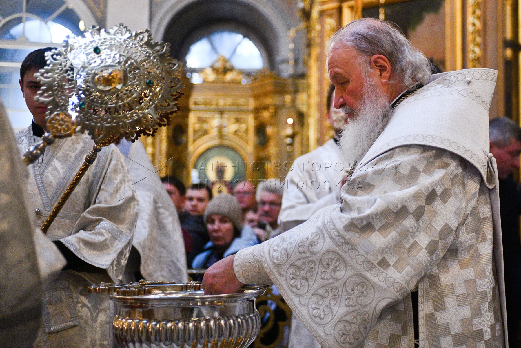 Патриарх Московский и всея Руси Кирилл (по центру) совершил чин великого освящени...