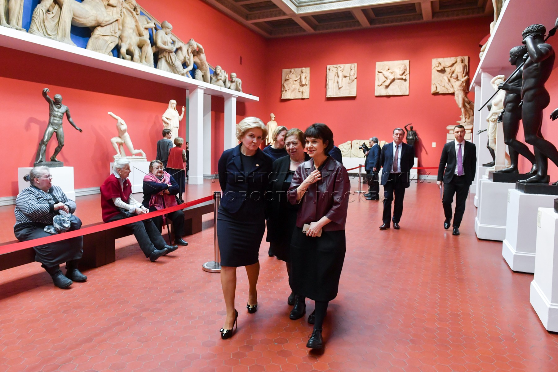 Заместитель председателя правительства РФ Ольга Голодец, куратор выставки Виктория Маркова и директор ГМИИ им. А.Пушкина Марина Лошак (слева направо) во время открытия и предпоказа выставки «Гости из Неаполя. Артемизия Джентилески и современники» в Государственном музее изобразительных искусств им. А.Пушкина.