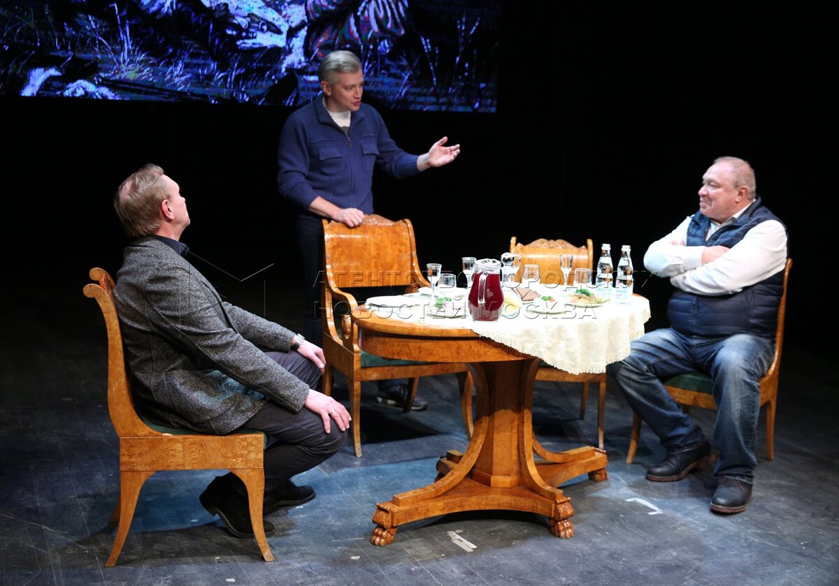 • Описание: Директор Государственного музея А.С.Пушкина Евгений Богатырев во время премьерного моноспектакля «Нельзя спасти камер-юнкера Пушкина» в театре «Школа современной пьесы».