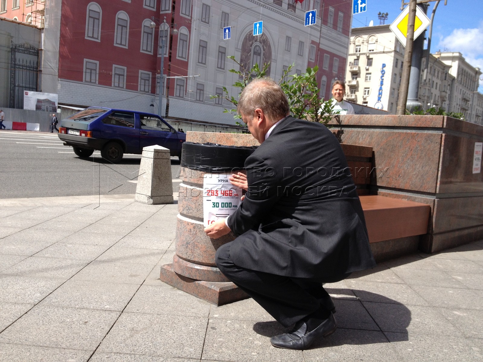 • Описание: Кандидат в мэры Москвы от партии «Яблоко» Сергей Митрохин по пути в Мосизбирком устроил агит-прогулку по Тверской улице с приклеиванием на урны, лавочки и контейнеры стикеров с информацией об их стоимости.