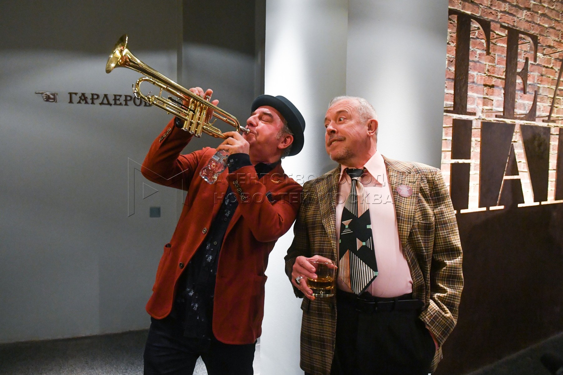 • Описание: Автор: Киселев Сергей. Лидер группы «Чайф» Владимир Шахрин, музыкант Андрей Макаревич (слева направо) перед презентацией спектакля «Стиляги» в Театре Наций.