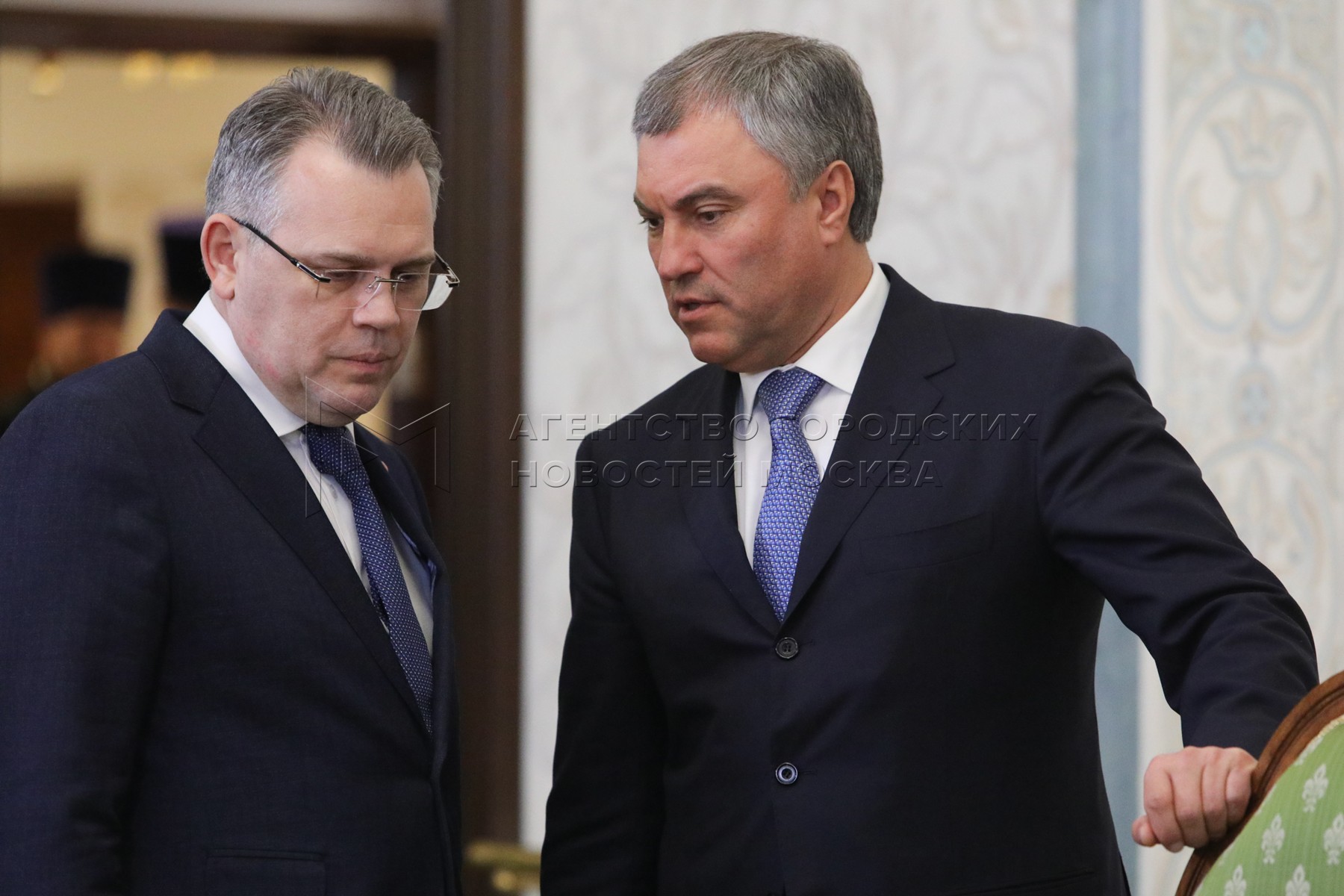 - Описание: Председатель Государственной Думы РФ Вячеслав Володин (справа) на совместном заседании наблюдательного, попечительского и общественного советов по изданию «Православной энциклопедии» и презентация томов за 2018 г. в храме Христа Спасителя в Москве.