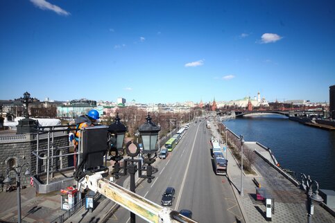 Весенняя промывка и покраска фонарей в рамках традиционного весеннего месячника по благоустройству Москвы.