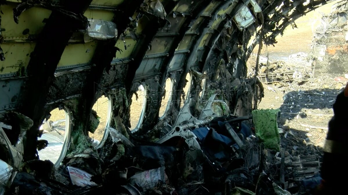 Самолет Sukhoi Superjet 100 с бортовым номером RA-89098 авиакомпании «Аэрофлот» после ликвидации возгорания в аэропорту Шереметьево. Снимок с видео. Источник - Следственный комитет РФ.
