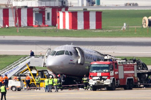 Самолет Sukhoi Superjet 100 после ликвидации возгорания в аэропорту Шереметьево