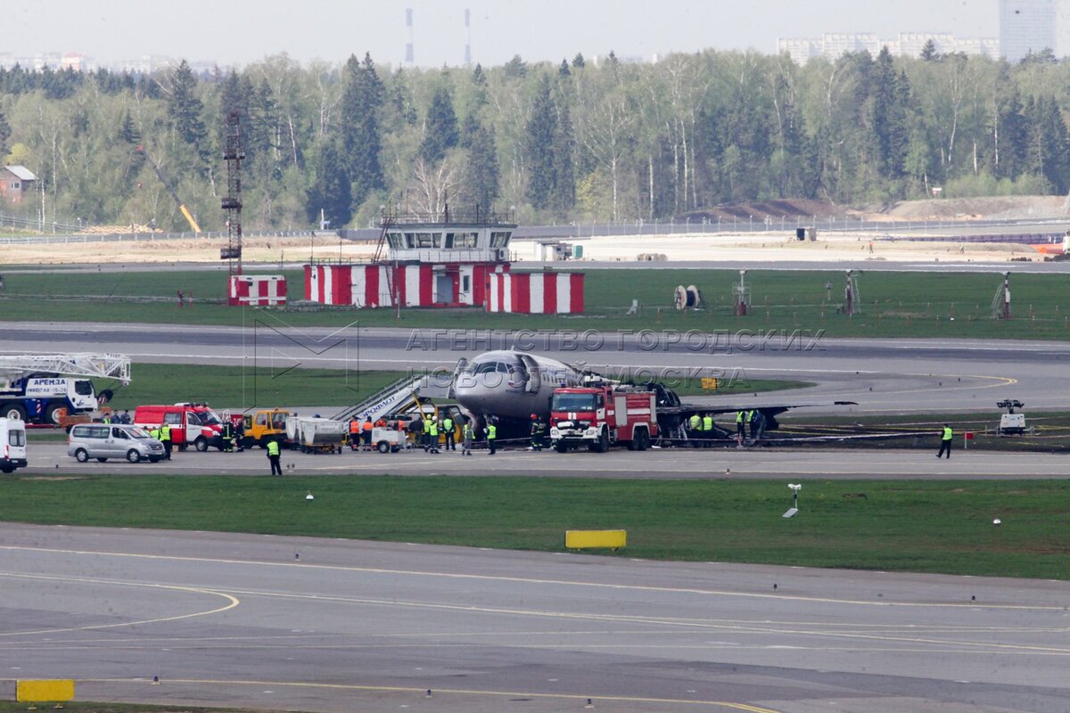 - Заголовок: Самолет Sukhoi Superjet 100 после ликвидации возгорания в аэропорту Шереметьево