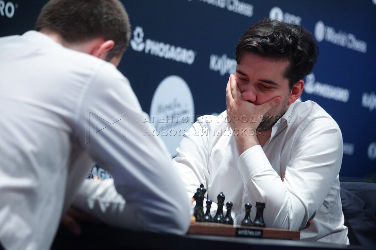 Гроссмейстеры Александр Грищук (слева) и Ян Непомнящий во время финальной игры мо...
