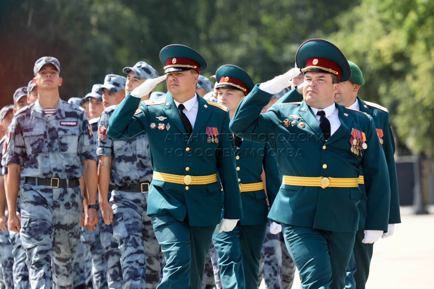 Командир Отдельной дивизии оперативного назначения им. Ф.Дзержинского дивизии генерал-майор Дмитрий Черепанов во время церемонии передачи главному храму Росгвардии воинского походного ковчега с частицами мощей святых покровителей воинства - святителя Спиридона Тримифунтского, святого великомученика Георгия Победоносца и святого апостола Андрея Первозванного, а также воинской походной хоругви с изображением святого апостола Андрея Первозванного.