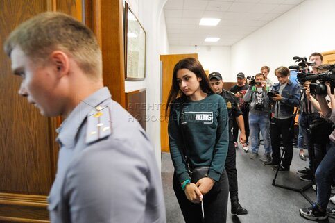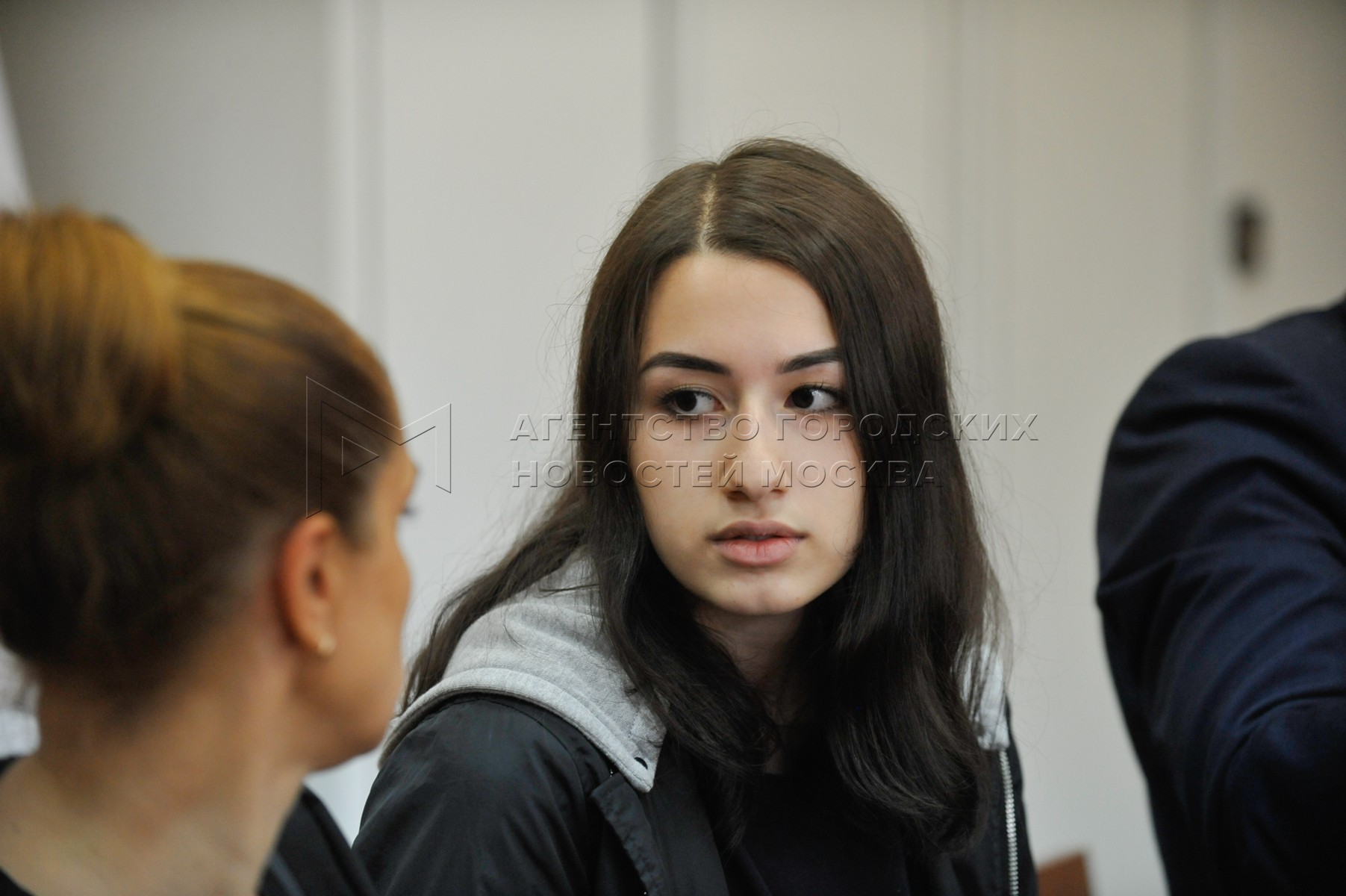 - Описание: Одна из сестер Ангелина Хачатурян (справа), обвиняемая в соучастии в жестоком убийстве своего отца, перед началом рассмотрения ходатайства следствия о продлении домашнего ареста в Басманном суде.