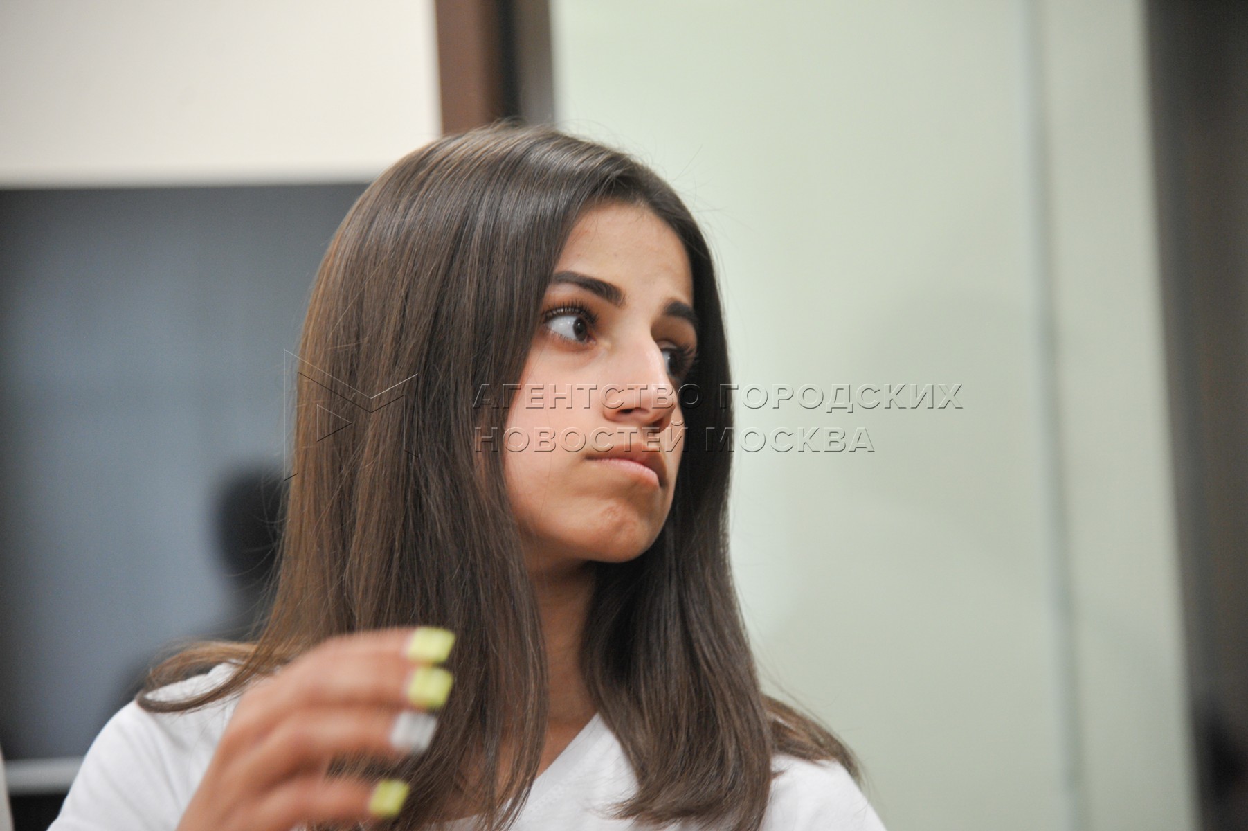 Одна из сестер Ангелина Хачатурян, обвиняемая в соучастии в жестоком убийстве своего отца, перед началом рассмотрения ходатайства следствия о продлении домашнего ареста в Басманном суде.