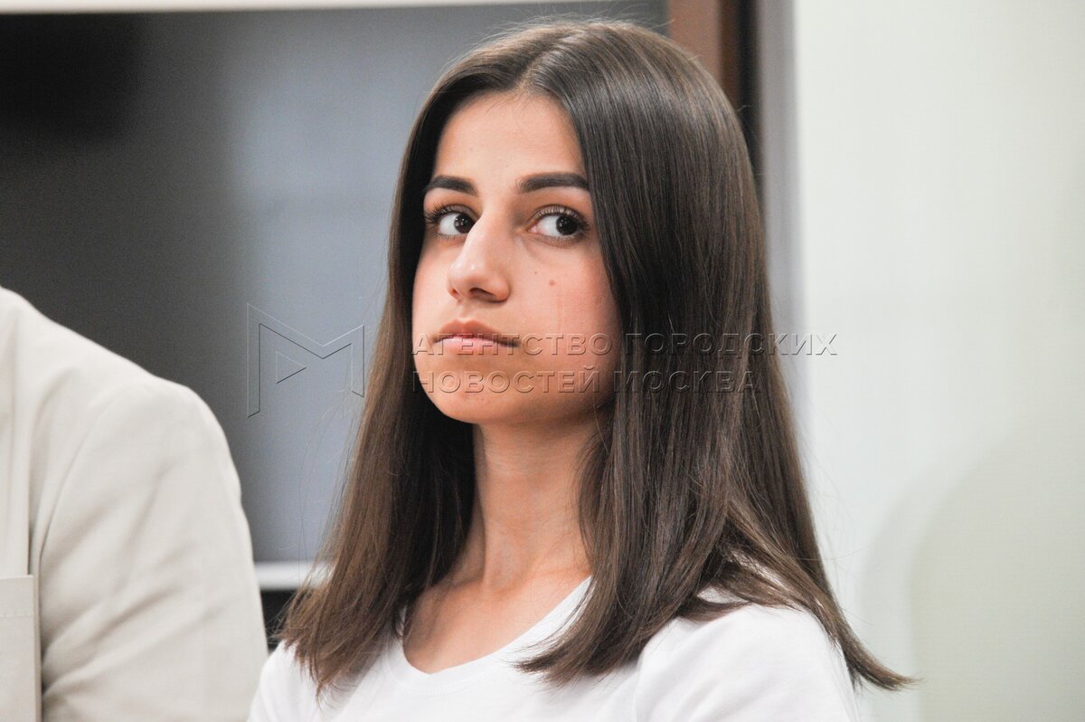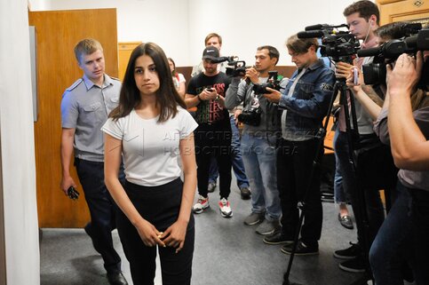 - Описание: Одна из сестер Ангелина Хачатурян (справа), обвиняемая в соучастии в жестоком убийстве своего отца, перед началом рассмотрения ходатайства следствия о продлении домашнего ареста в Басманном суде.