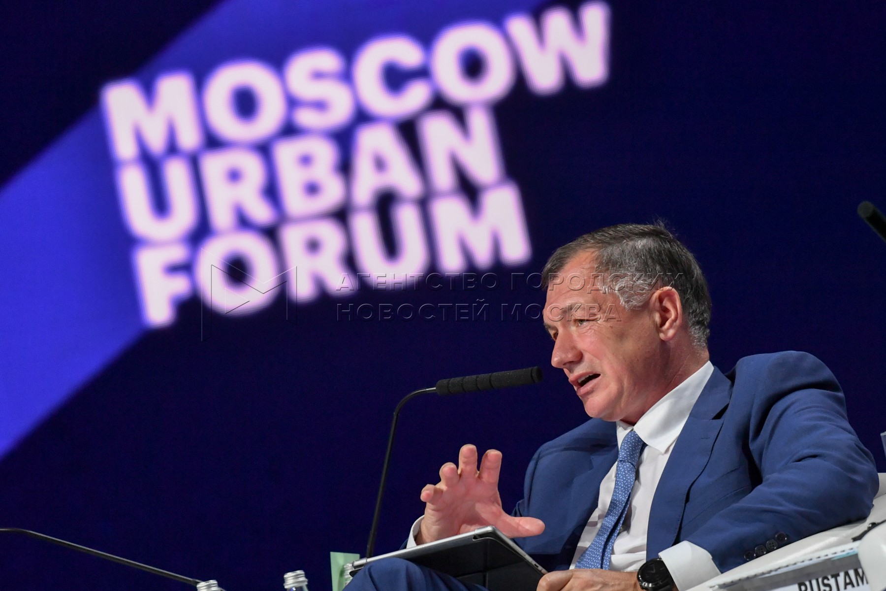 • Описание: Заместитель мэра Москвы в правительстве Москвы по вопросам градостроительной политики и строительства Марат Хуснуллин во время пленарных сессий на Московском урбанистическом форуме - 2019 в парке «Зарядье».